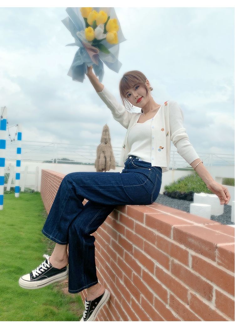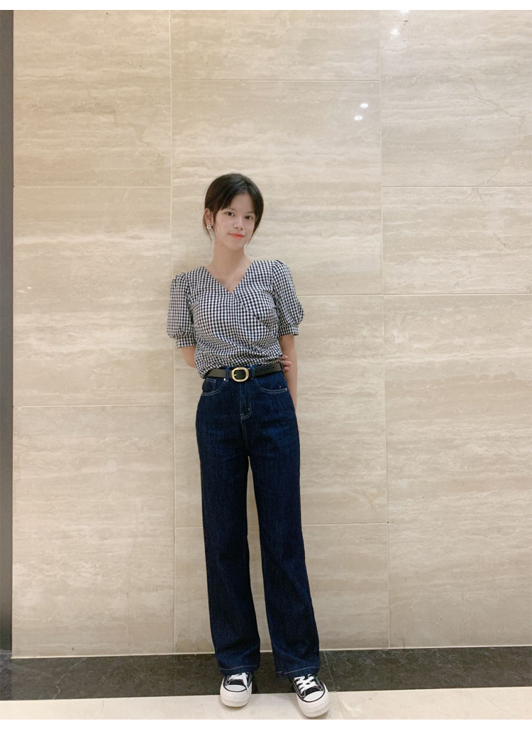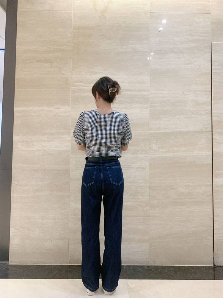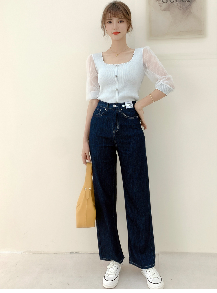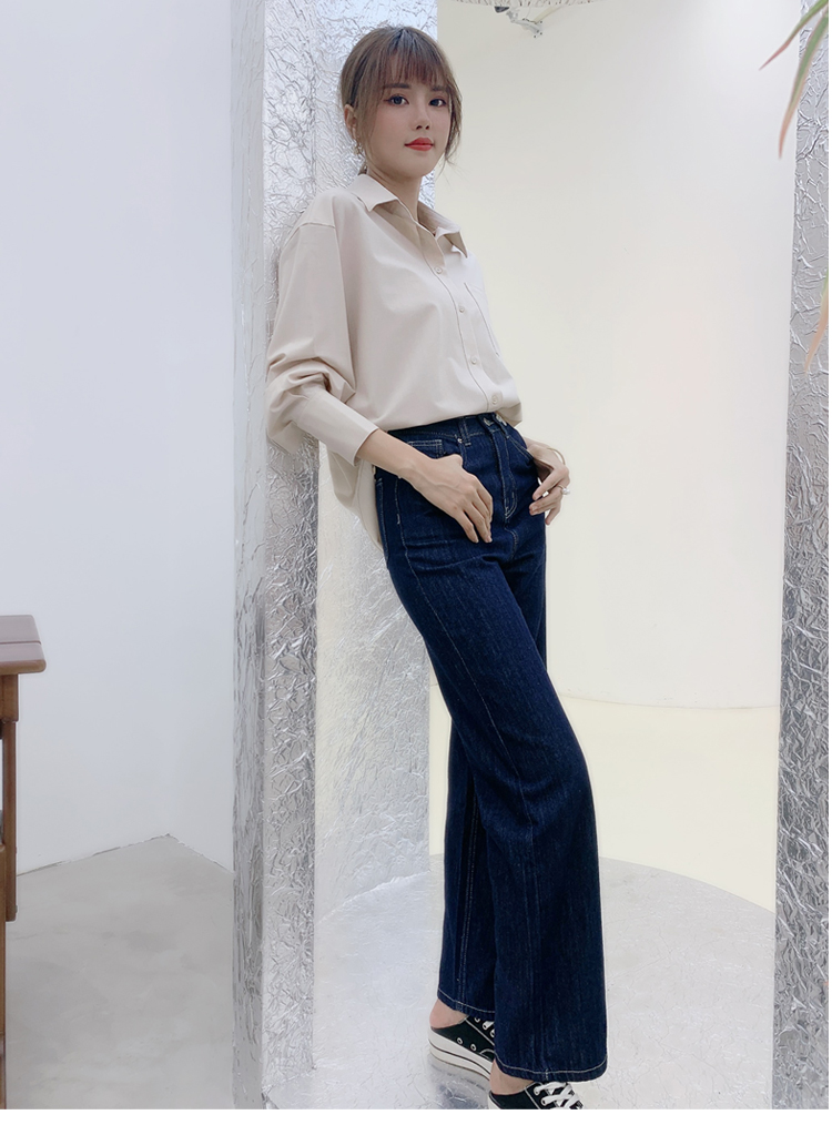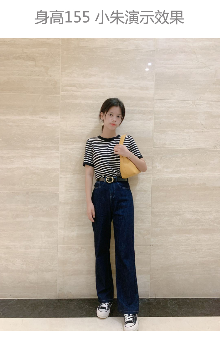 面料:100%棉适合温度:20-35度适合季节:春夏秋颜色:深蓝色弹力:面料无弹力腰型:高腰裤长:长款版型:直筒型穿脱方式:裤门襟