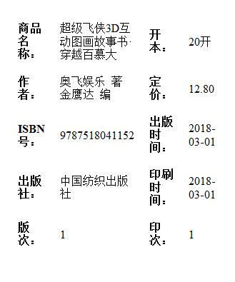 奥飞娱乐是中国知名的动漫上市公司,曾经打造出“巴啦啦小魔仙”“铠甲勇士”等驰名品牌,是中国目前颇具实力和发展潜力的动漫文化产业集团公司,以发展民族动漫文化产业,为世界创造快乐、智慧和梦想为使命,立志做中国动漫文化产业的领导者。“超级飞侠”系列是是奥飞动漫历经三年重金打造的一部全新儿童3D动画作品。br金鹰达是一家专注于虚拟现实(VR)、增强现实(AR)与3D互联网领域的软硬件研发与推广的文化科技公司。公司依托自主知识产权的虚拟现实平台软件,结合国际先进的以图形图像为核心的数字媒体技术,致力于以丰富童书阅读体验为目标的图书策划和自主创新立体互动技术。......- 中国纺织出版社有限公司 (微信公众号认证)