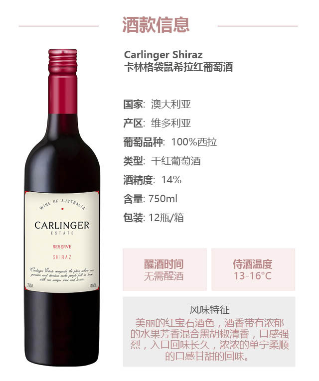 【整箱六瓶】卡林格-西拉红葡萄酒 Carlinger Shiraz 750ml*6