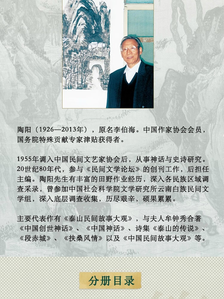 陶阳,原名李伯海,1926年生,2013年5月29日病逝。1953年毕业于山东大学中文系,1955年调入中国民间文艺家协会,从事神话与史诗研究。历任北京大学哲学系助教,国家文化部艺术局群众文化处负责人,中国民间文艺家协会书记处书记、研究部主任,《民间文学论坛》主编。中国作家协会会员,国务院特殊贡献专家津贴获得者。一生著作甚丰,其主要代表作有《泰山民间故事大观》,与夫人牟钟秀合著《中国创世神话》、《中国神话》、诗集《泰山的传说》、《段赤城》、《扶桑风情》以及《中国民间故事大观》等。