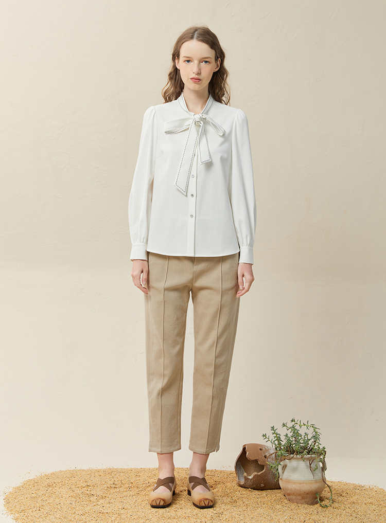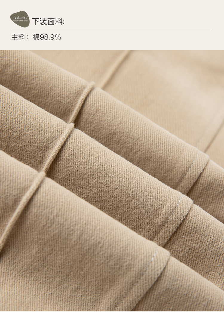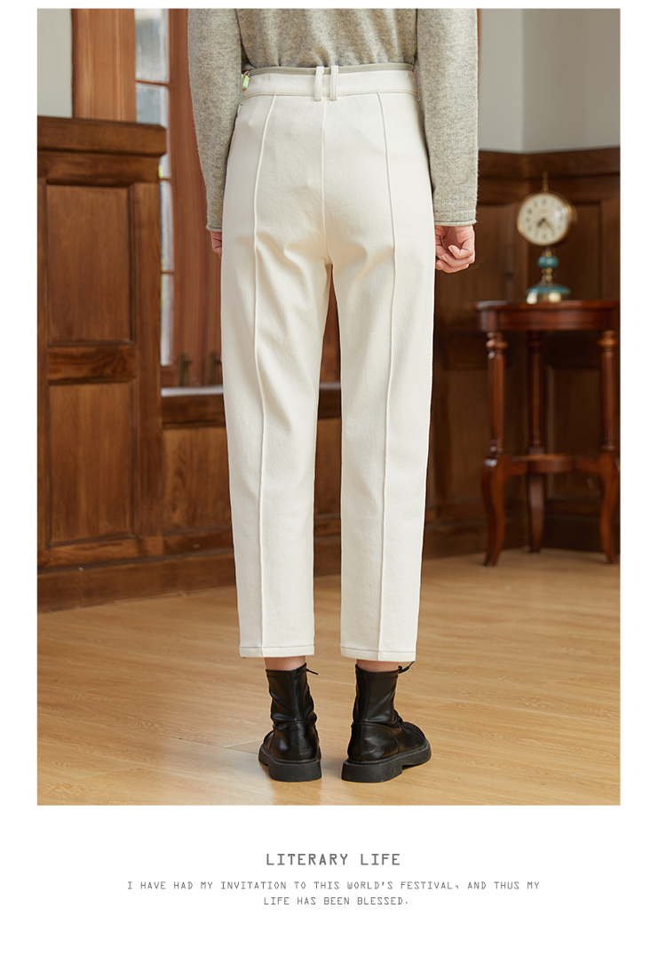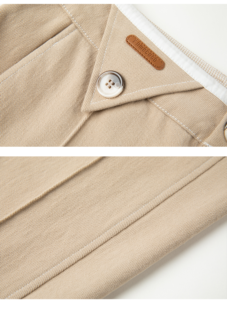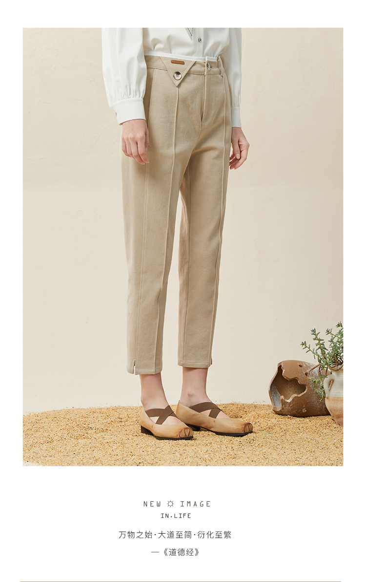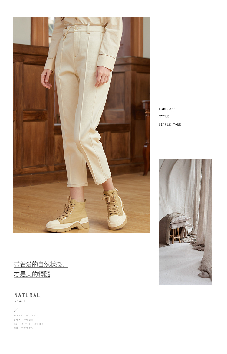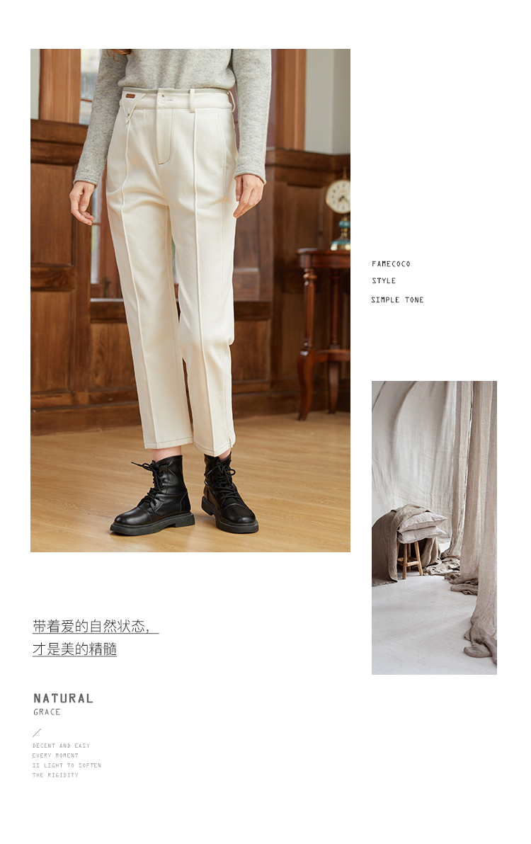 Famecoco范可儿明线休闲裤女显瘦纯棉百搭裤脚开叉直筒裤F228GA004