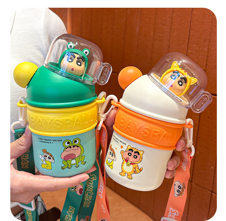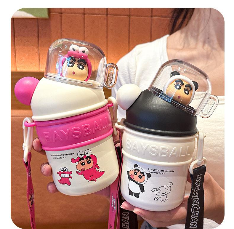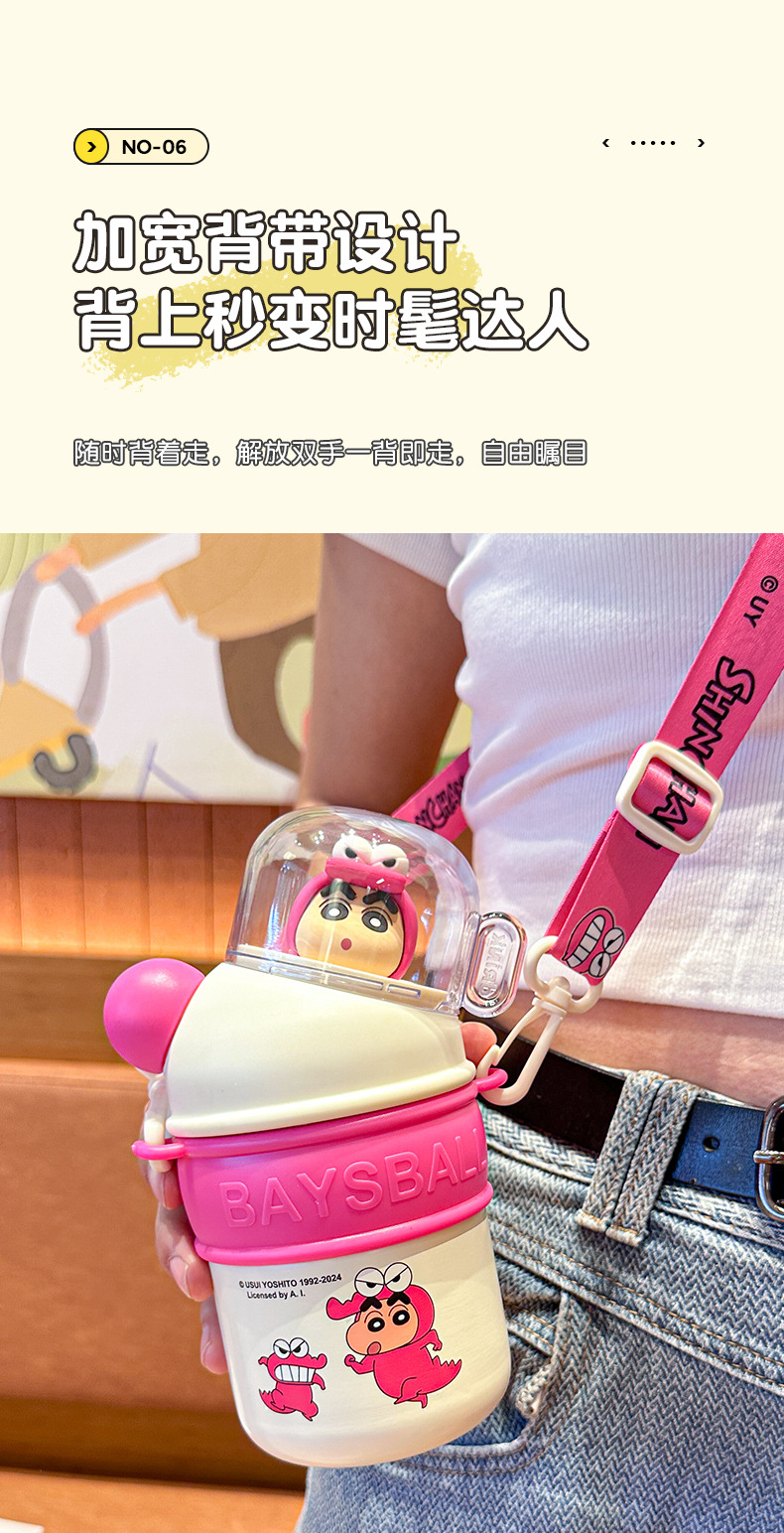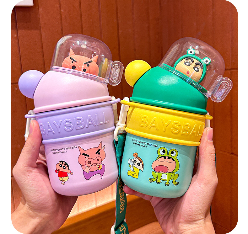 【可拆卸吸管!一杯三饮】加宽背带设计,解放双手,蜡笔小新小透明316保温杯户外高颜值水杯上学吸管杯子防摔保温杯。rb
