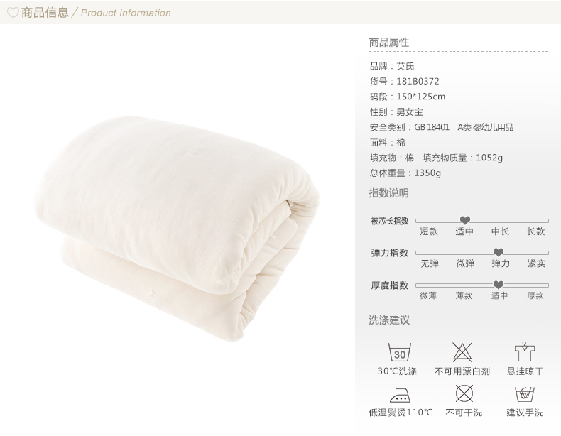 英氏婴儿被子棉花被宝宝棉被冬季加厚保暖幼儿园1.5被芯181B0372