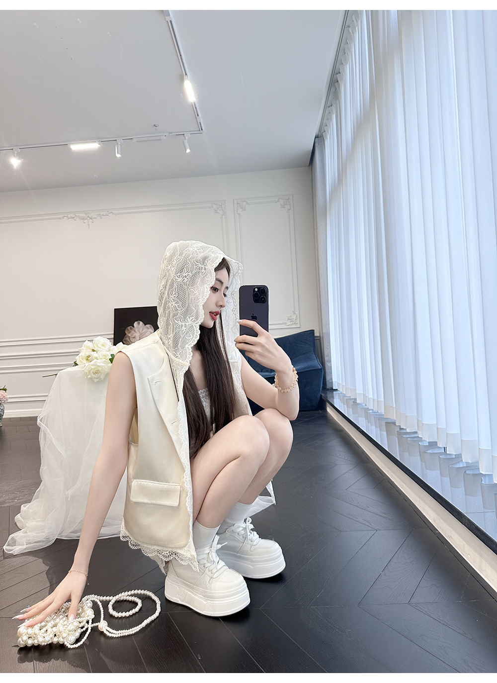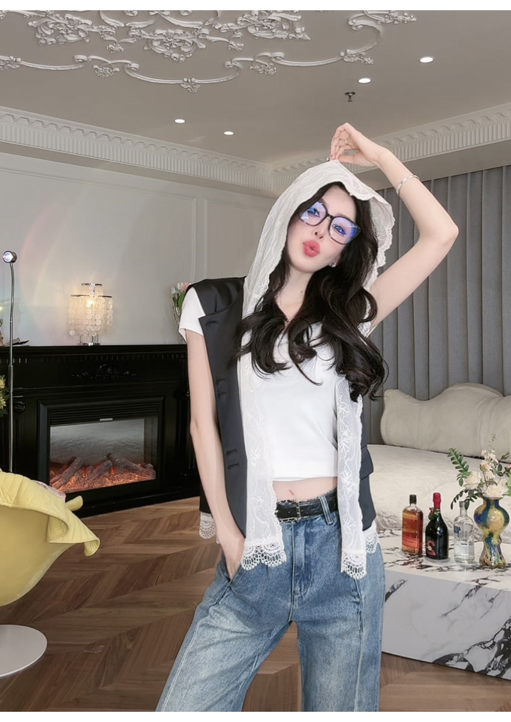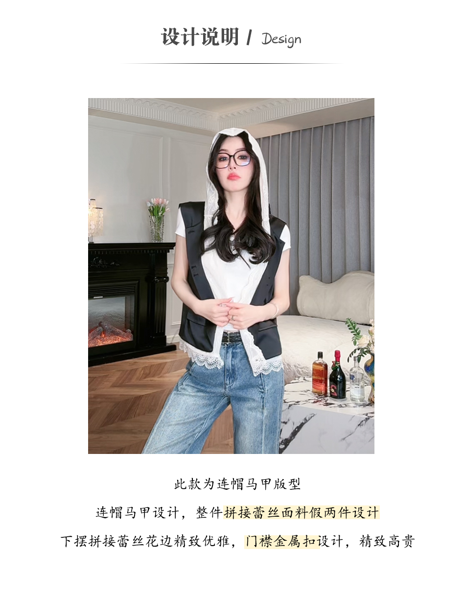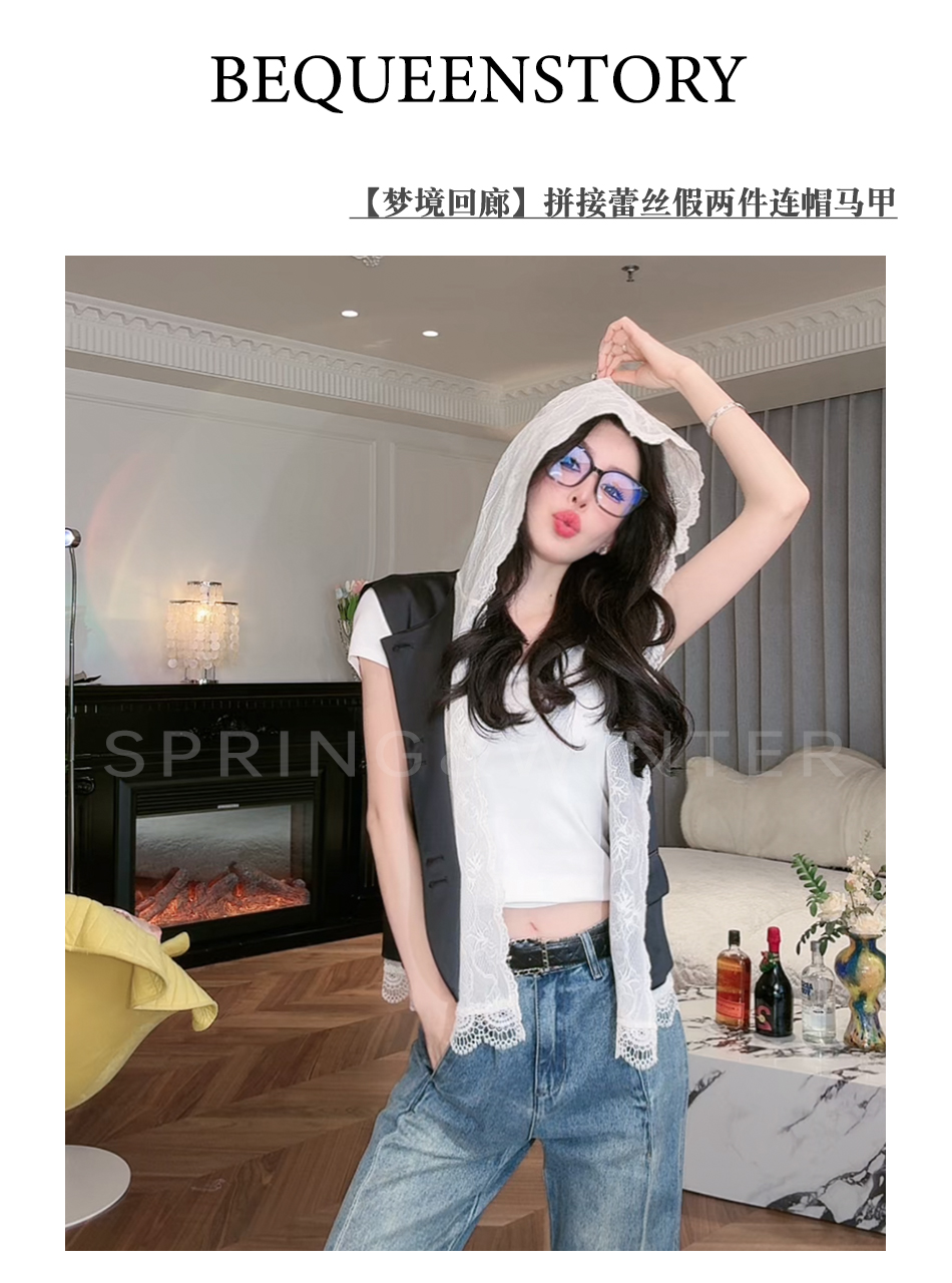 BeQueenStory【梦境回廊】时髦气质设计感拼接蕾丝假两件连帽马甲