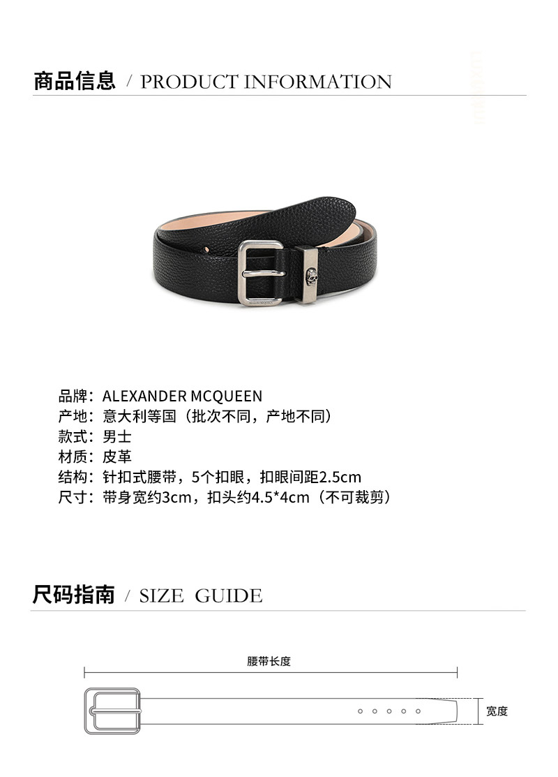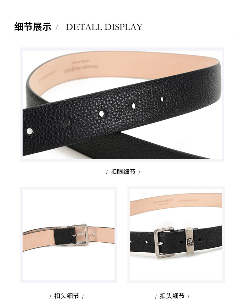 【国内现货】Alexander McQueen/亚历山大麦昆 2021款 男士皮革针扣式皮带腰带 647261 1AABB