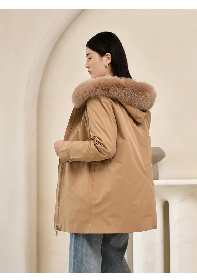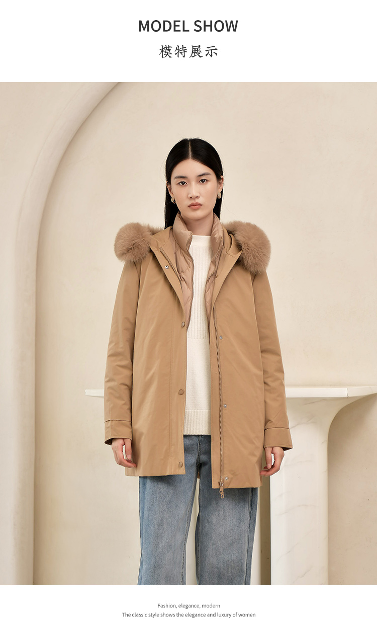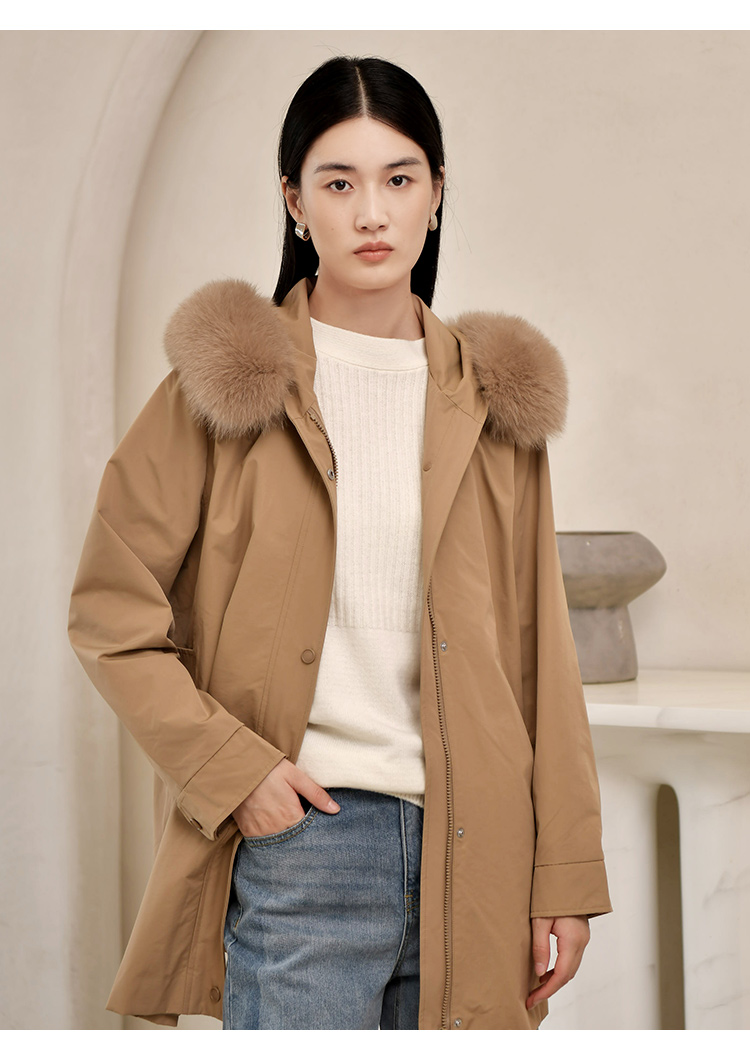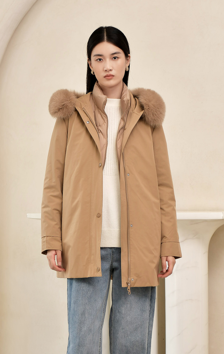 佐尔美2022冬季新款 英伦菱形走线内胆派克狐毛领羽绒服女E24YH04