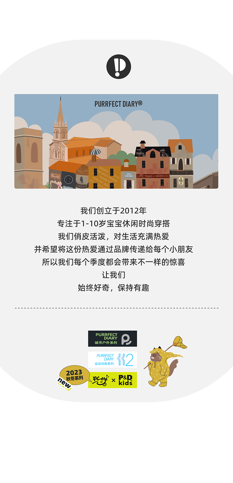 Purrfect-Diary专注于贴近自然随性的穿着概念,轻奢平价的童装文化传播,在产品设计上更加注重婴童穿着的舒适性、安全性、更出众的国际化品牌,将欧美的育婴文化在中国进行深入的传播与推广。