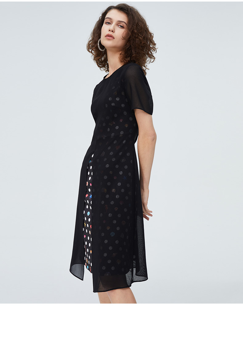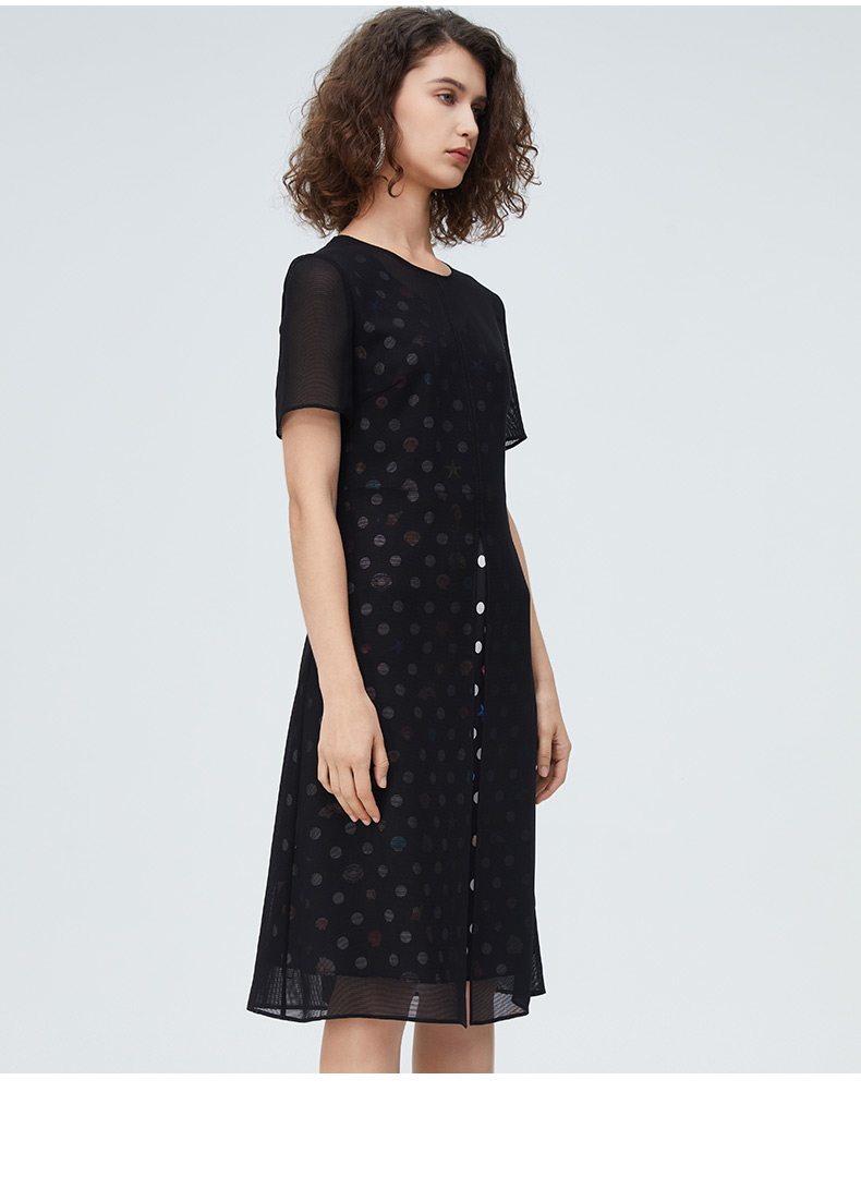 皮尔卡丹女装夏玫红色网纱袖V领短袖连衣裙A字裙P0200DS48D3