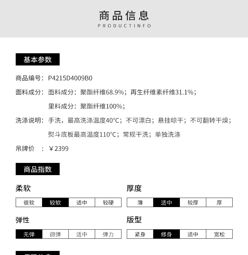 成熟、稳重、高贵典雅、大方得体 融合东方文化的含蓄和法国的浪漫 将创意的艺术性与消费需求相结合 为自信女性塑造高品质场合服装