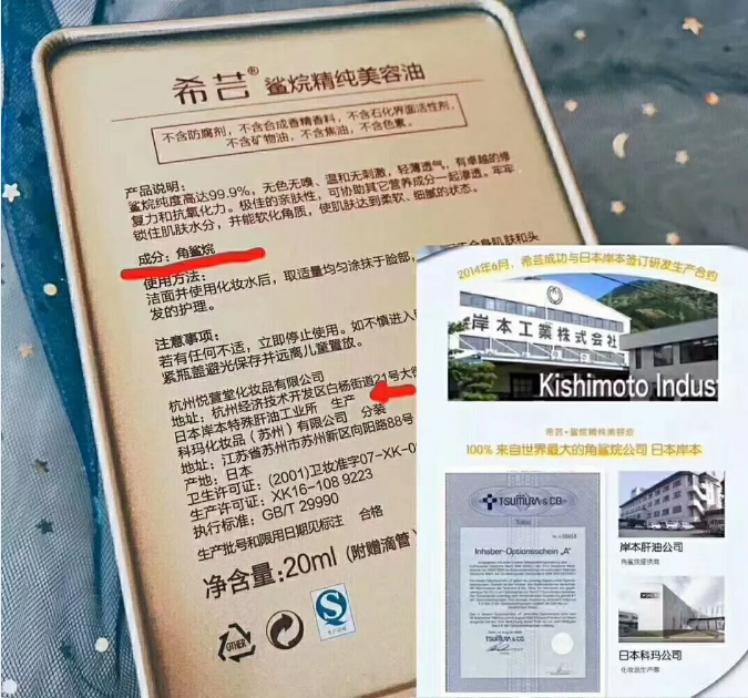 这瓶角鲨烷美容油,原料来自:日本岸本特殊肝油工业所