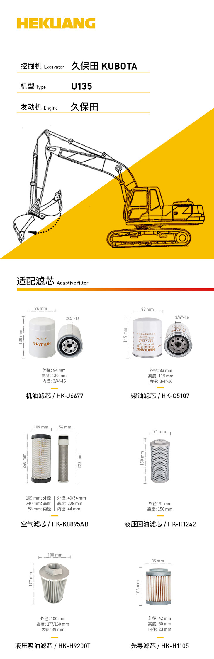 久保田U135(久保田)挖掘机滤芯 机油柴油空气滤芯 液压油吸油回油滤芯 先导滤芯
