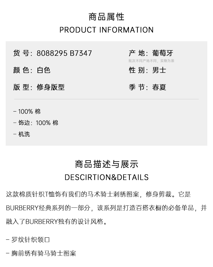 【一】BURBERRY 巴宝莉 男士马术骑士刺绣徽标棉质圆领短袖T恤 白色 8088295 B7347