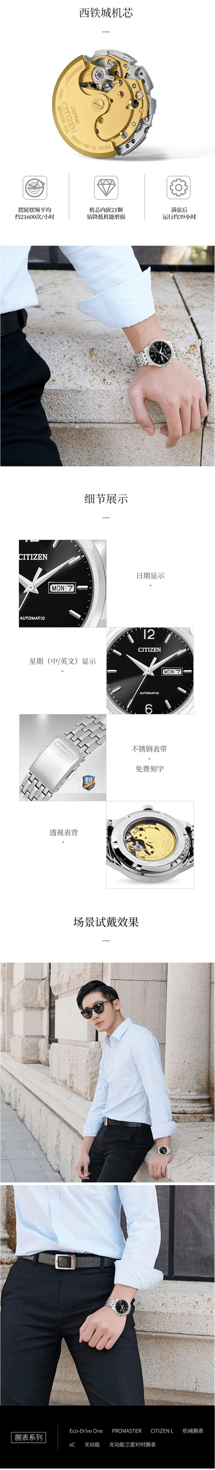 西铁城日本官方正品简约时尚商务钢带男士机械手表NH7500-53EB