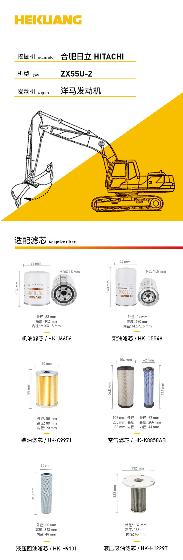日立ZX55U-2(洋马发动机)挖掘机滤芯 机油柴油空气滤芯 液压油先导滤芯