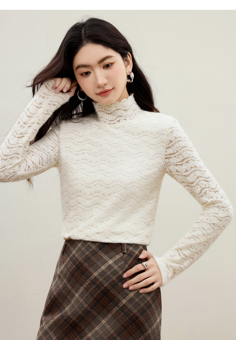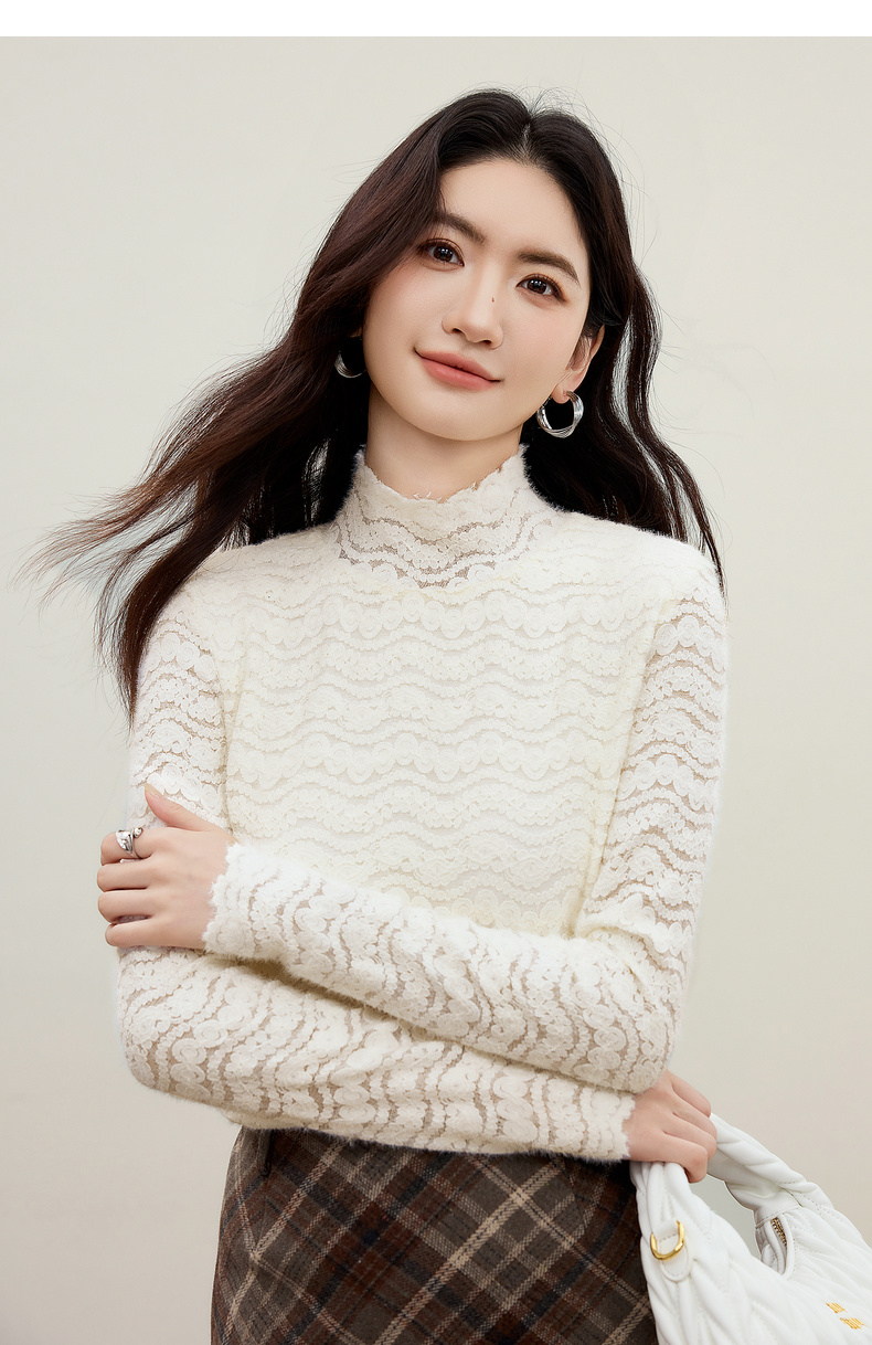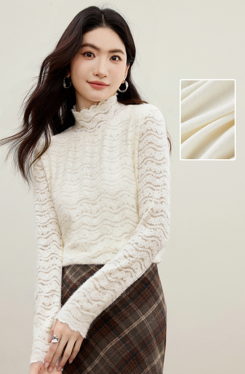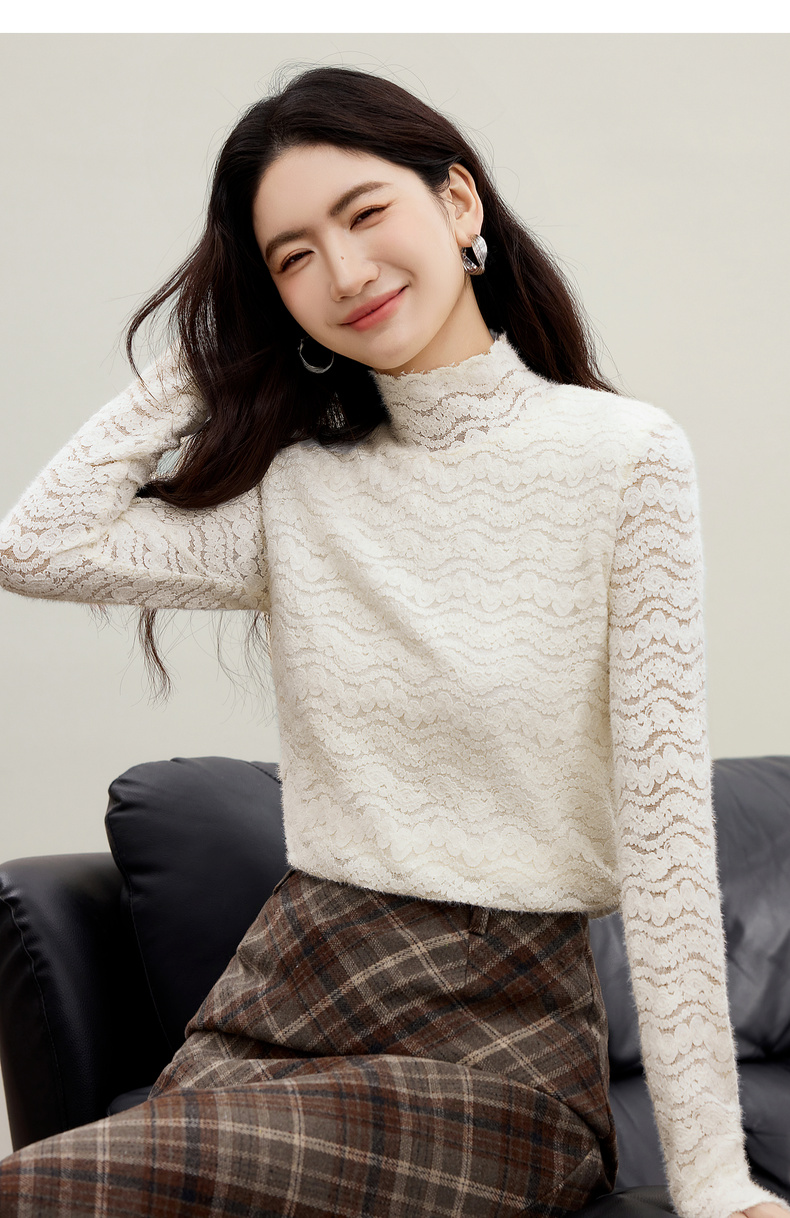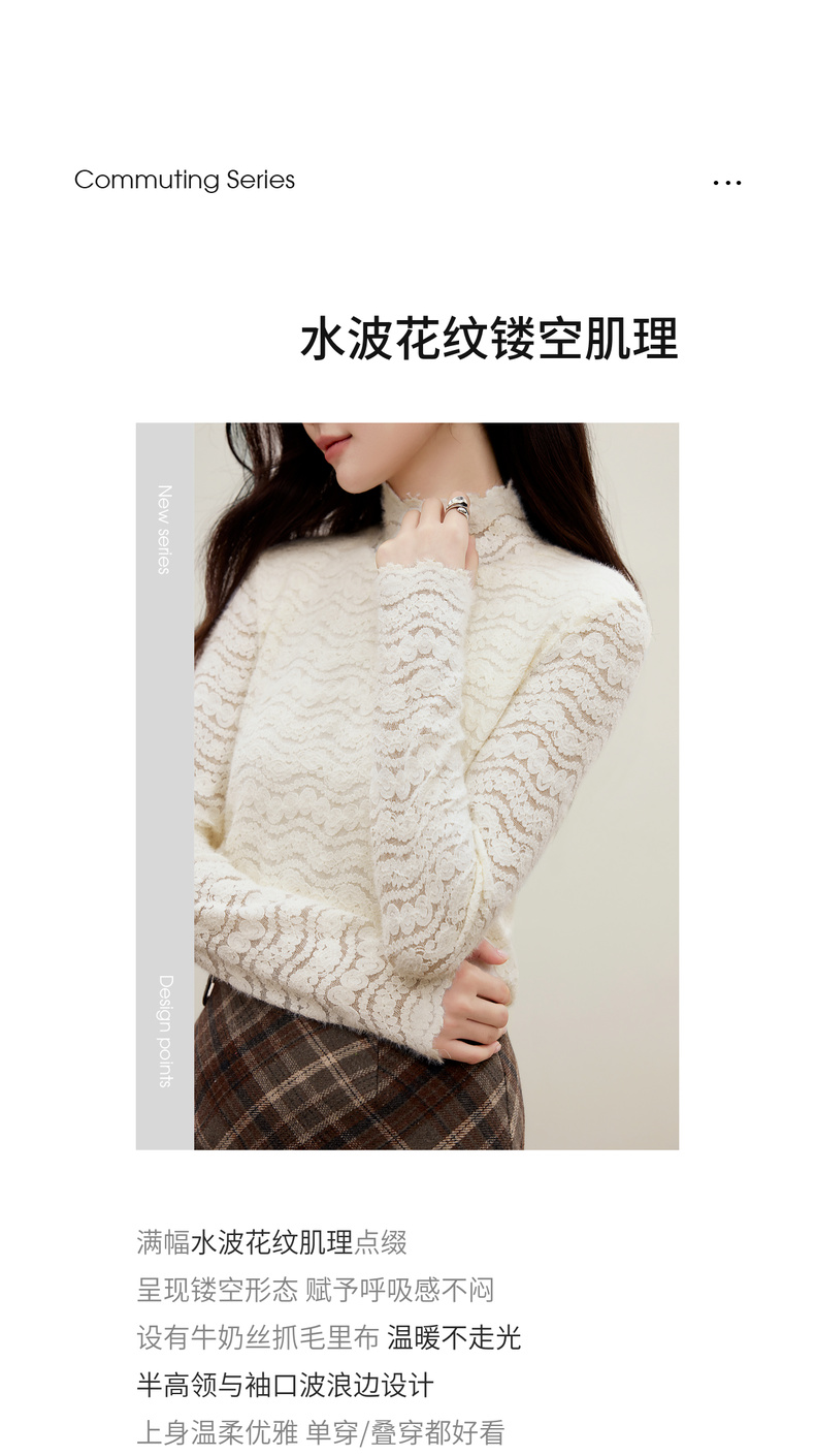 【内购】【镂空肌理】通勤波浪边半高领微弹磨毛不走光外穿内搭长袖蕾丝衫-153SA3129