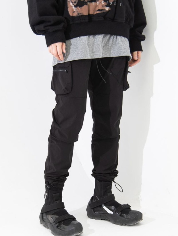 裤身比较长 堆堆裤脚的设计 裤脚有弹力抽绳 也是卡扣固定的