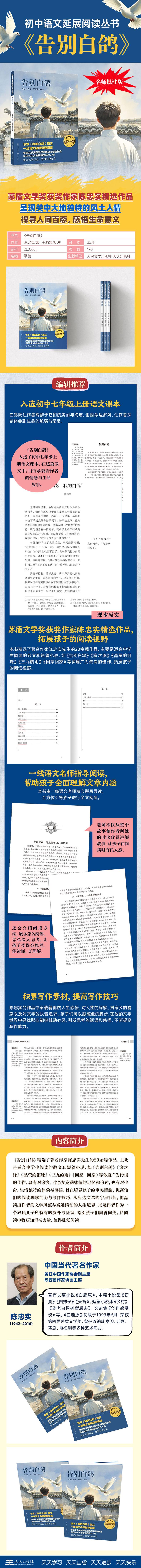 告别白鸽 茅盾文学奖获奖作家陈忠实精选作品,包含课本我的白鸽原文,一线语文名师指导阅读,呈现关中大地独特的风土人情,探寻人间百态,感悟生命意义 编辑推荐: • 茅盾文学奖获奖作家陈忠实精选作品,包含课本我的白鸽原文 • 一线语文名师指导阅读,提高孩子的阅读理解能力与写作技巧 • 呈现关中大地独特的风土魅力,探寻人间百态,感悟生命意义 • 指引孩子向真向善向美,从阅读中收获知识与力量