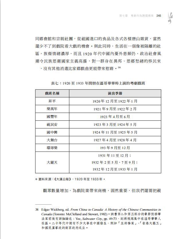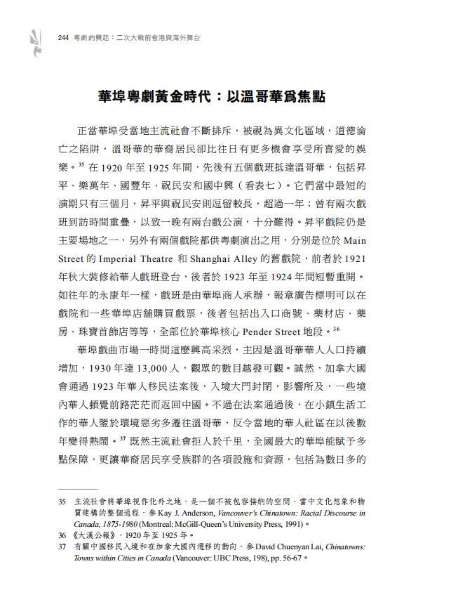 作者同時描繪十九世紀末二十世紀初伶人戲班透過移民網絡,散佈在東南亞和美洲的粵人聚居地的情形。這些地方一方面是粵劇演出之重鎮,另一方面是組織地區性巡演活動之聯絡、籌辦、集資中心。書中對於溫哥華的個案,對唐人街商人的熱情襄助、華埠大小社團之踴躍參與、粵劇融入僑社文化和社區活動等都有詳盡的討論。