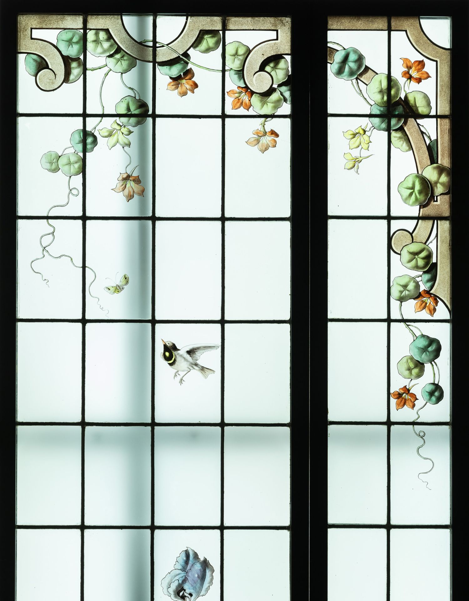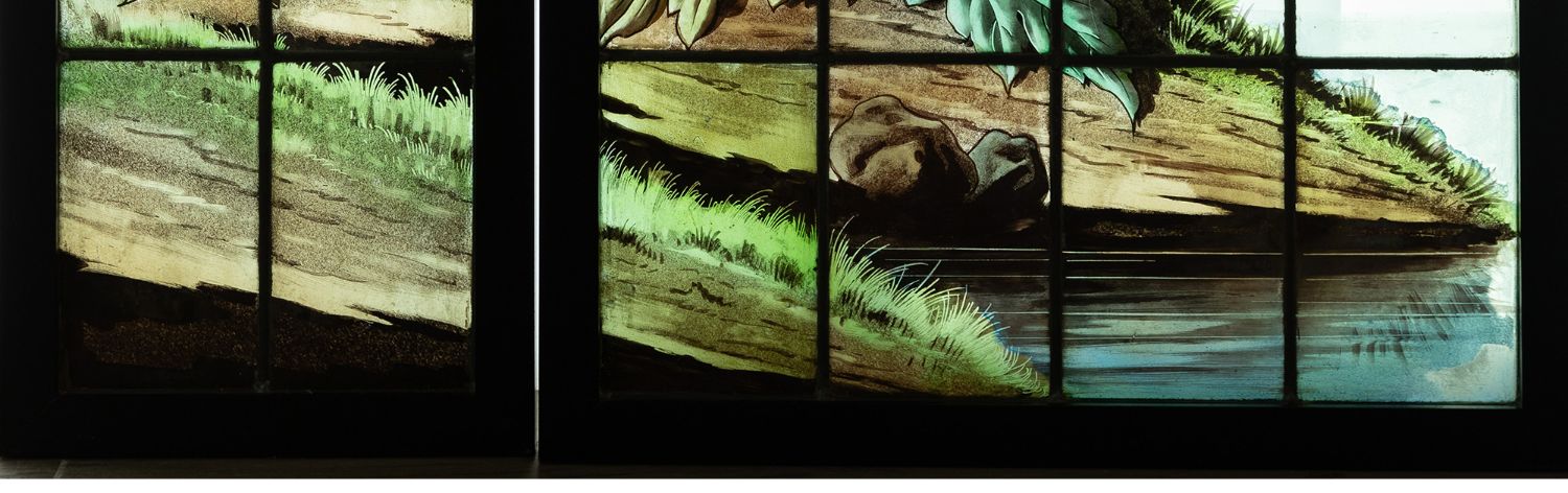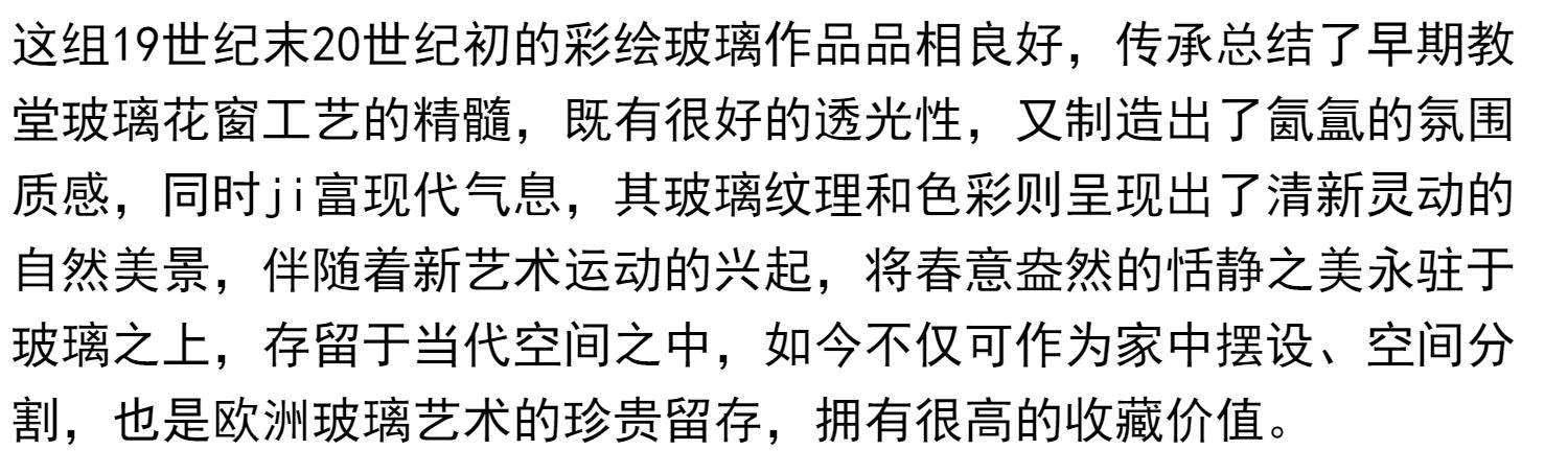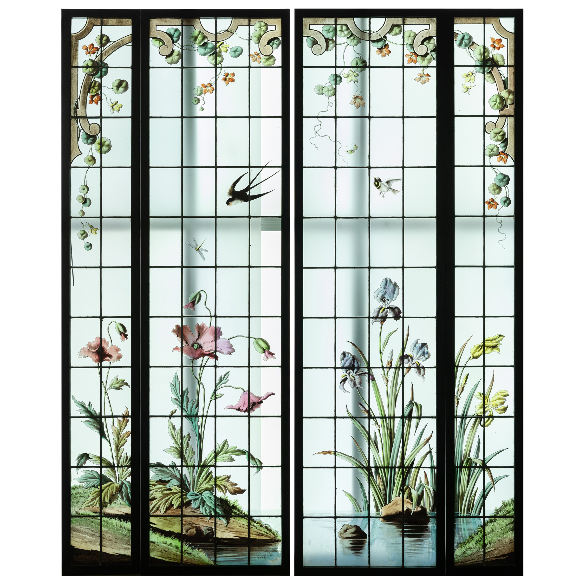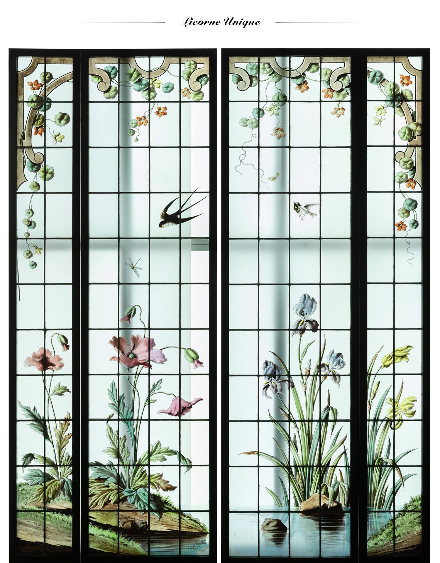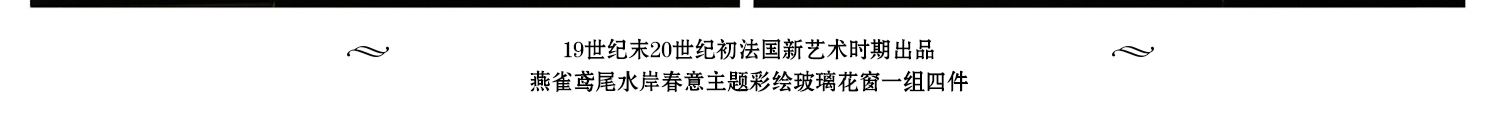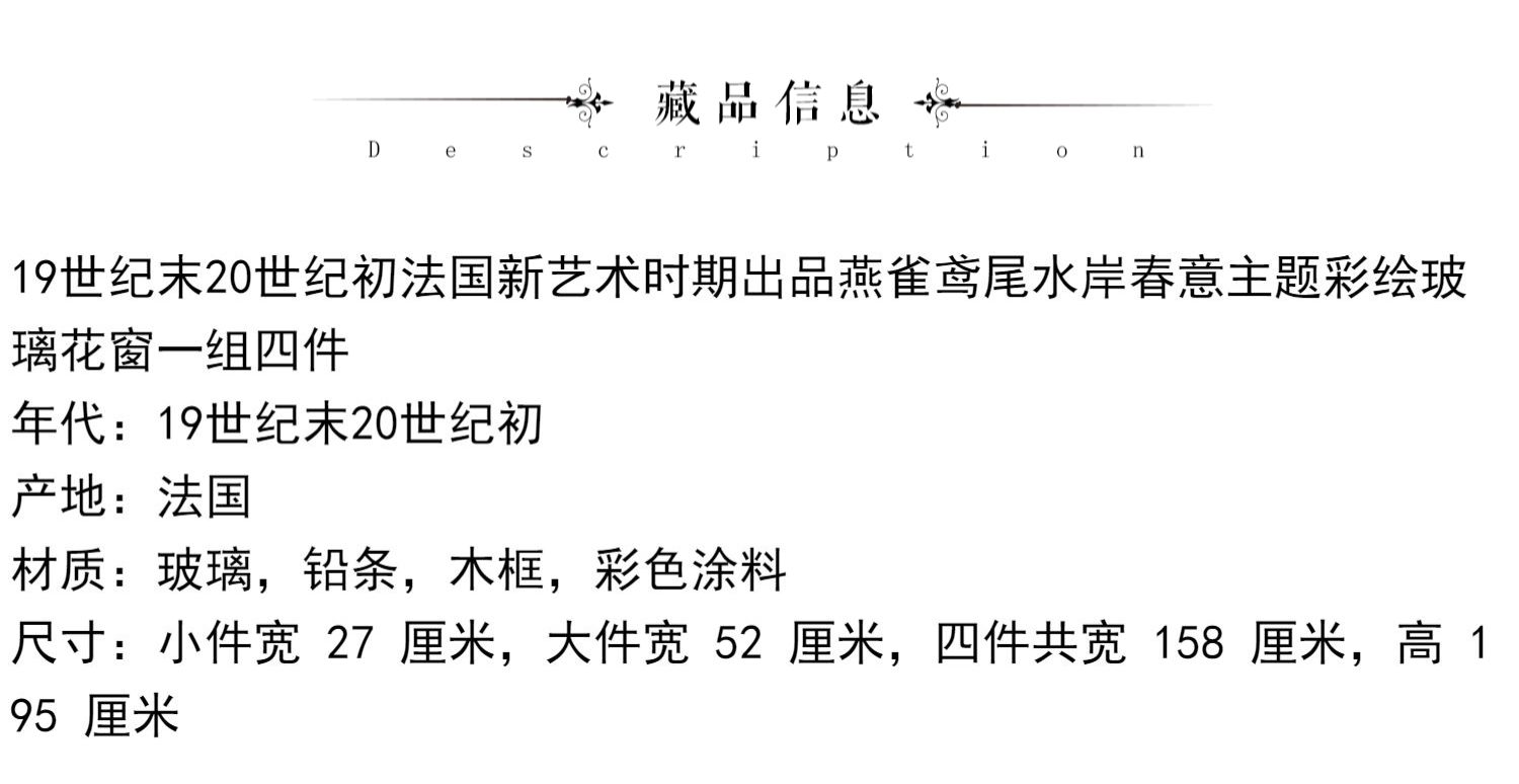 独角鹿西洋古董法国新艺术时期燕雀鸢尾水岸春绘玻璃花窗四件