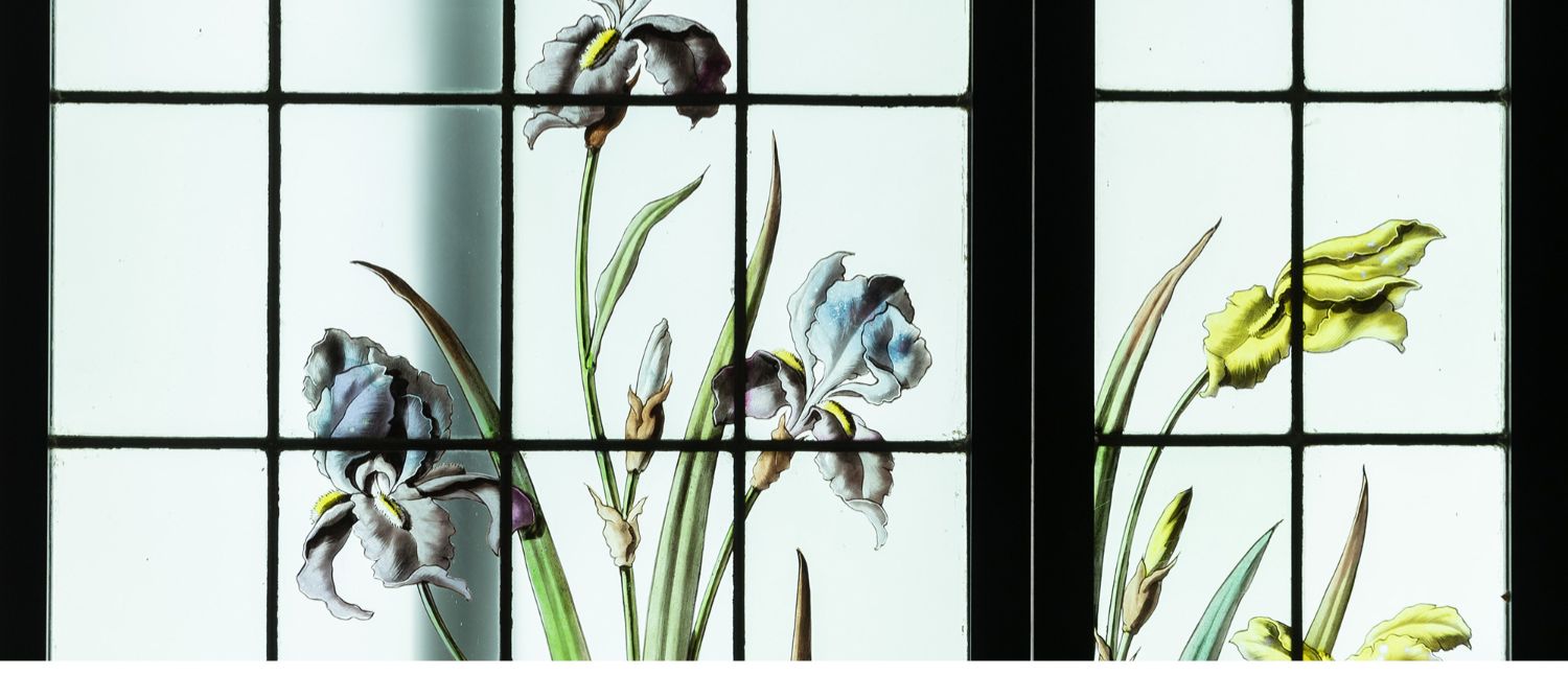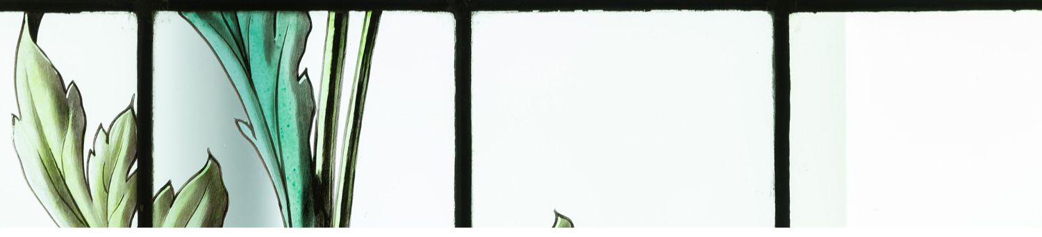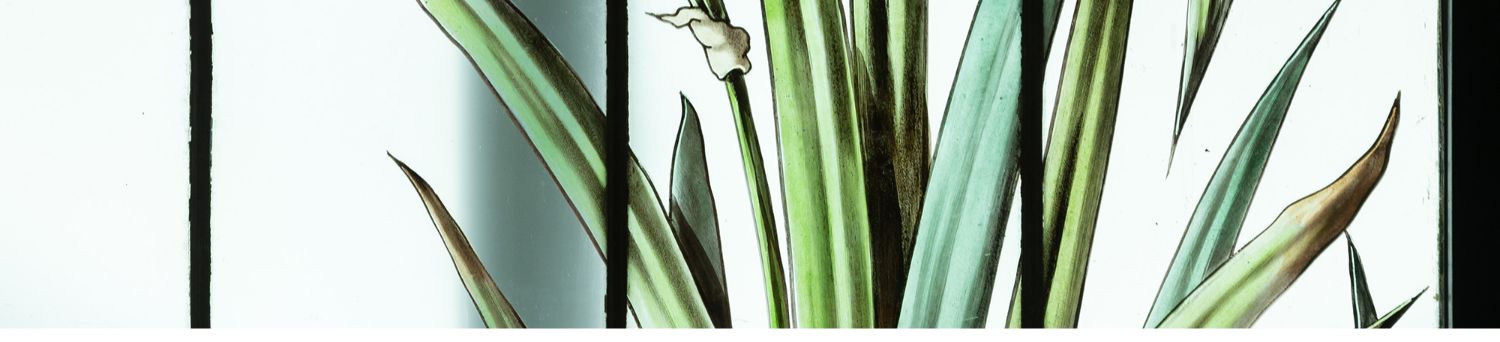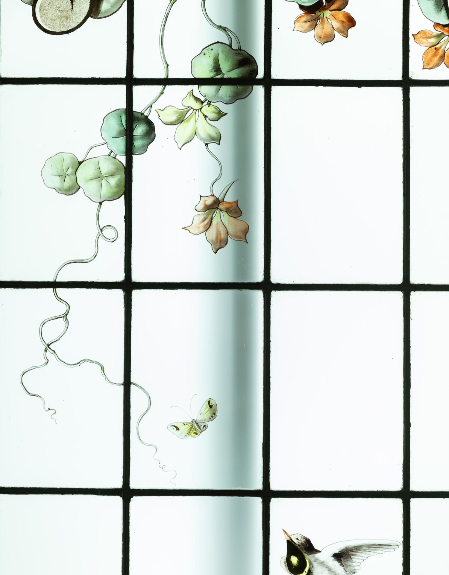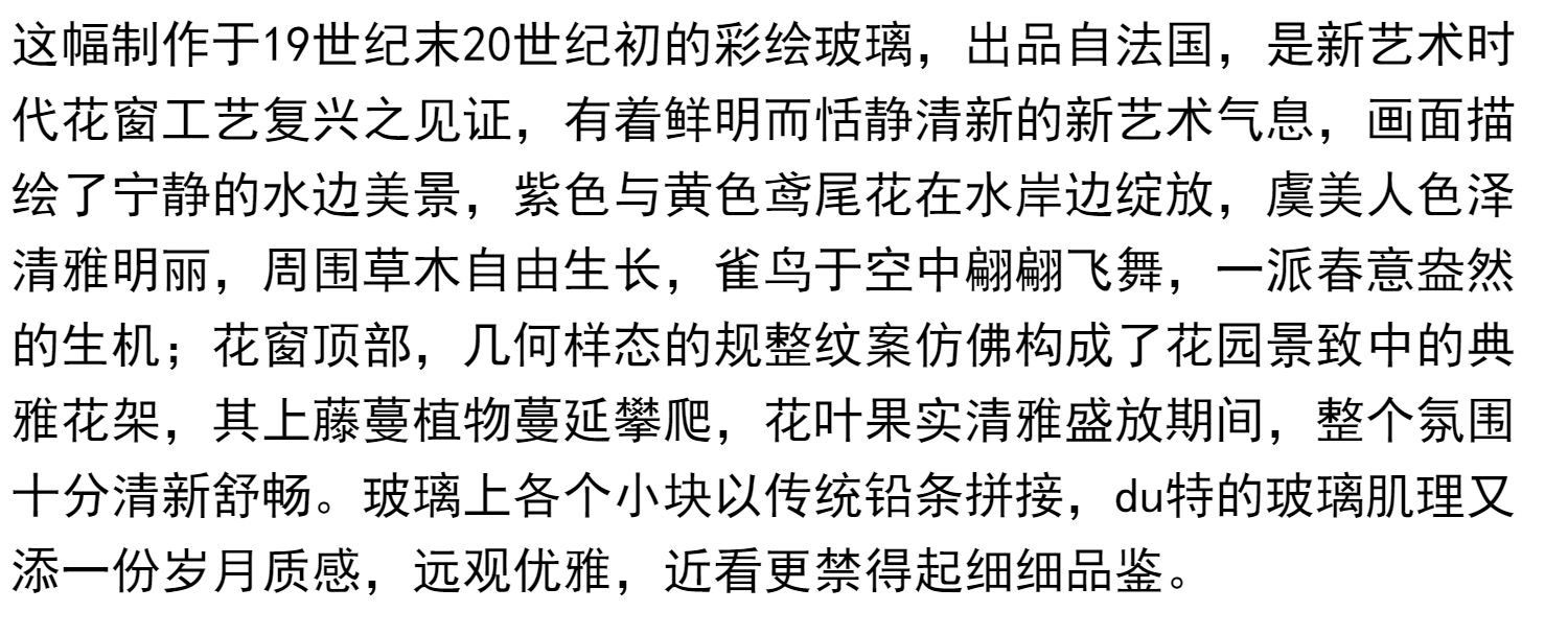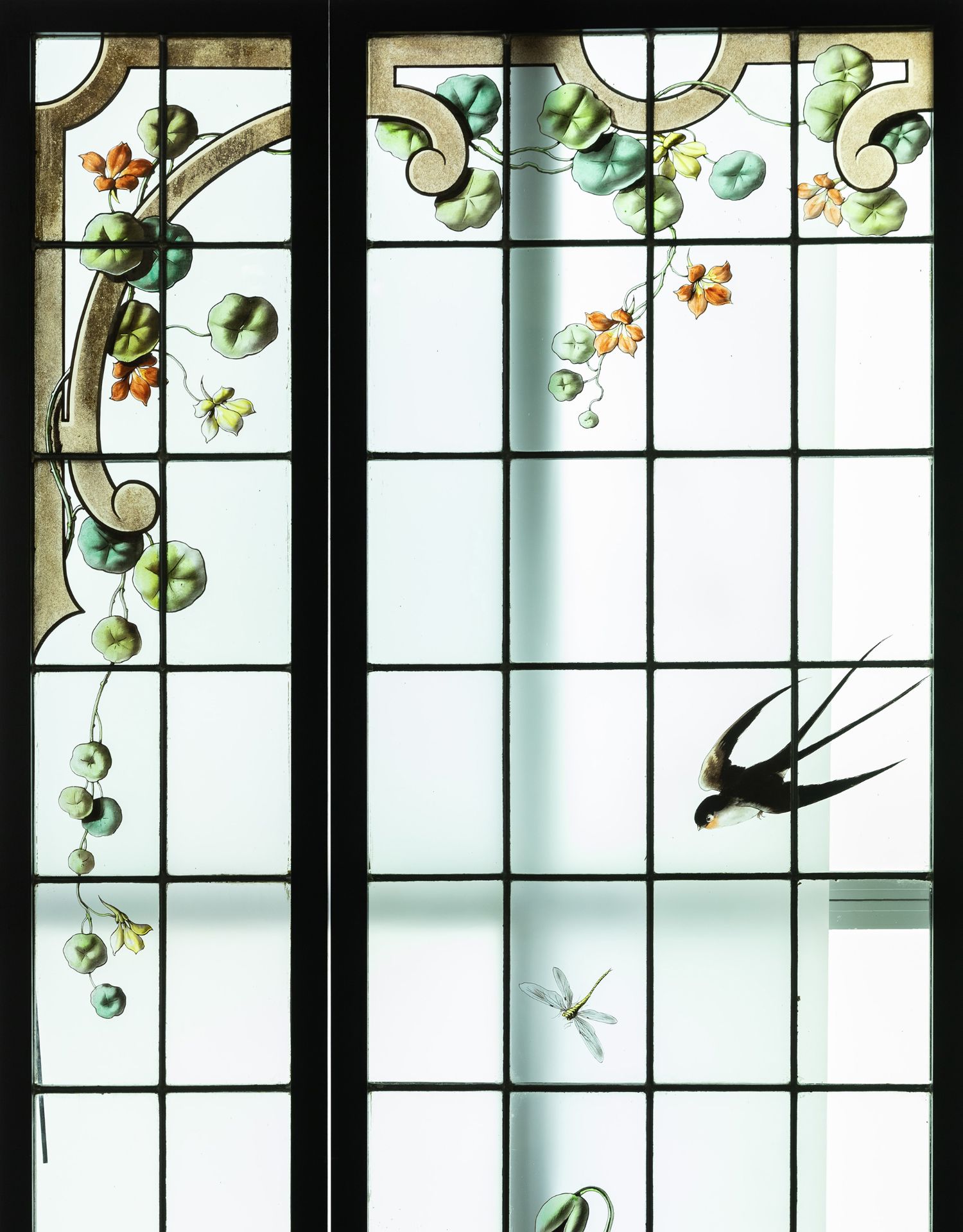 独角鹿西洋古董法国新艺术时期燕雀鸢尾水岸春绘玻璃花窗四件