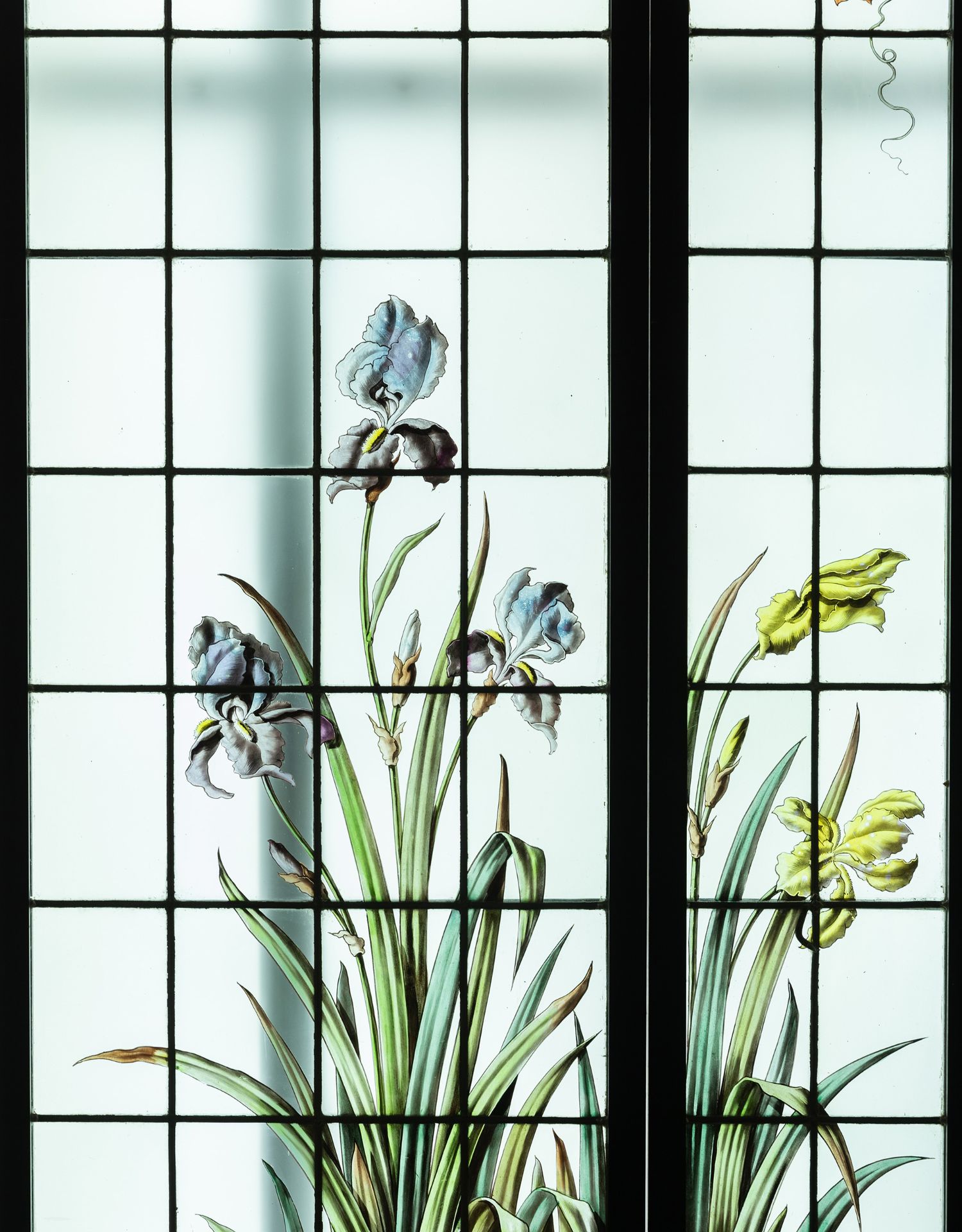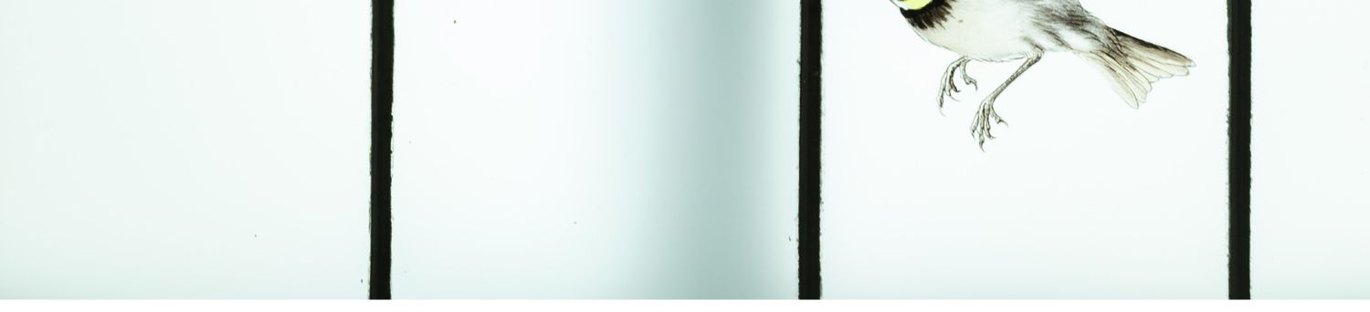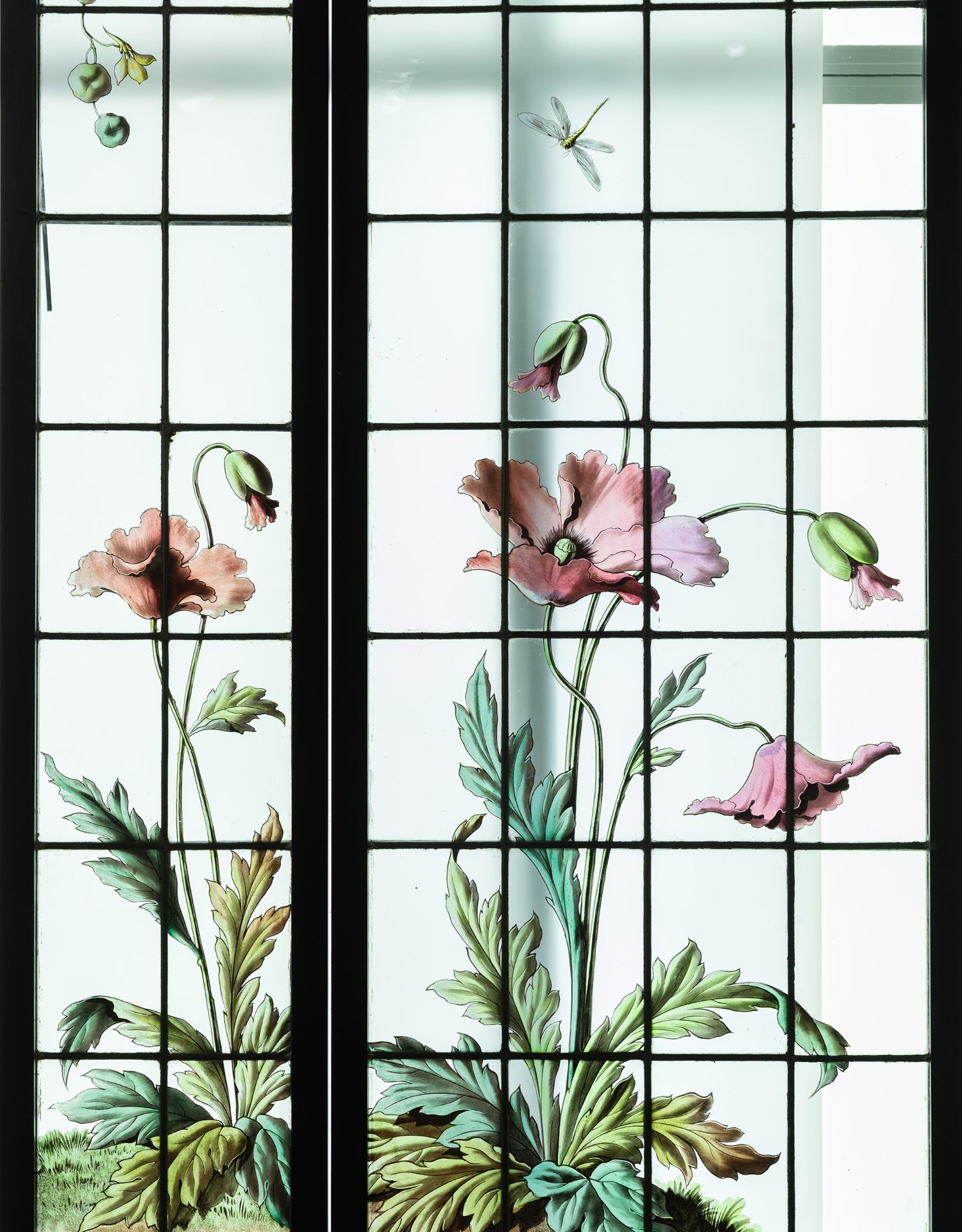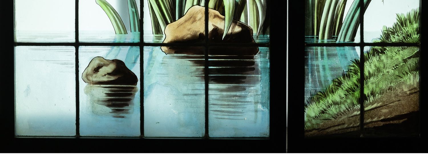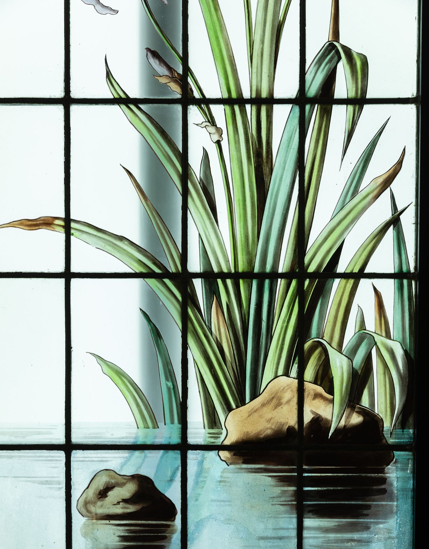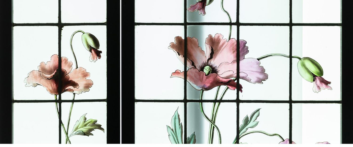 独角鹿西洋古董法国新艺术时期燕雀鸢尾水岸春绘玻璃花窗四件