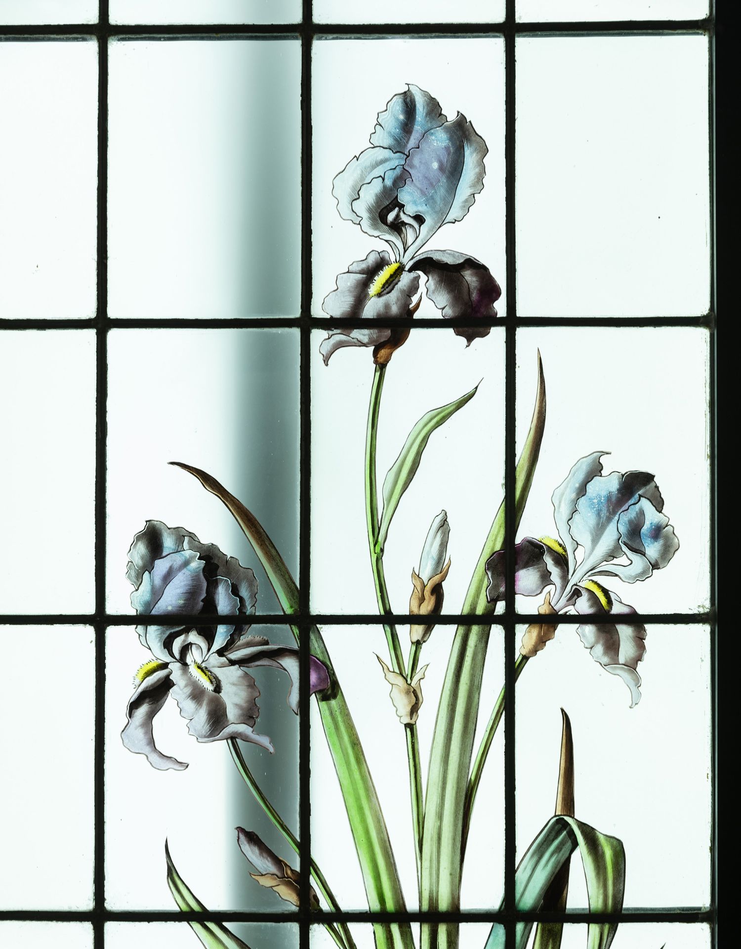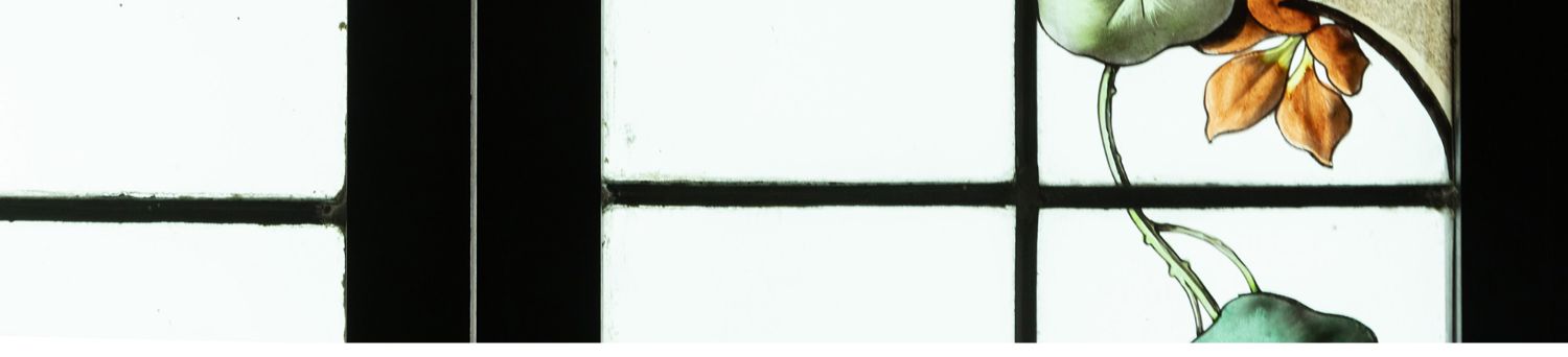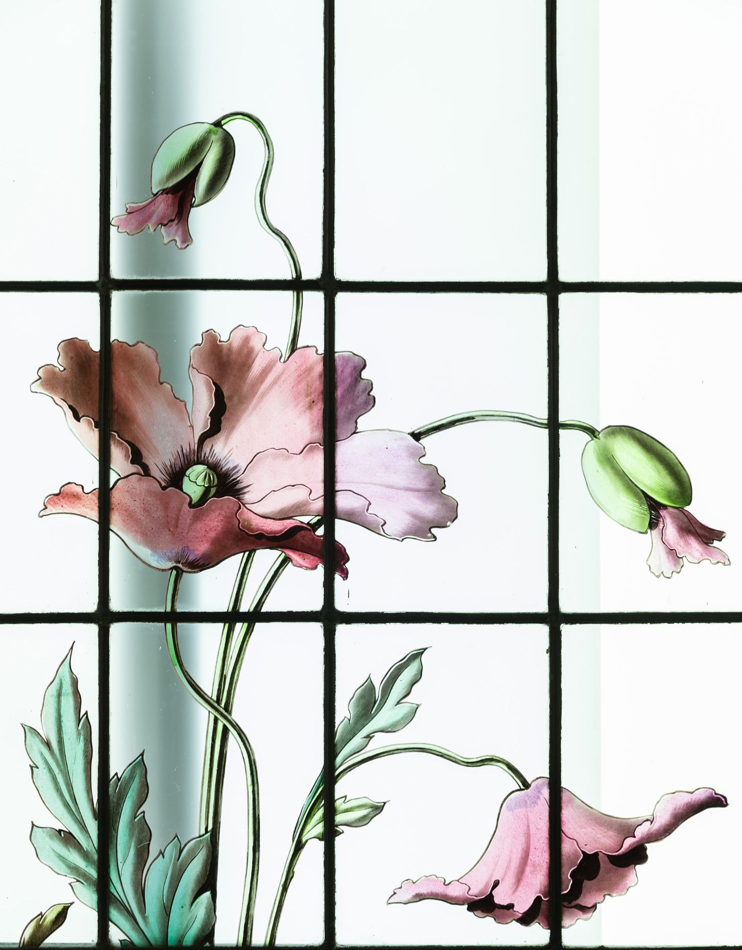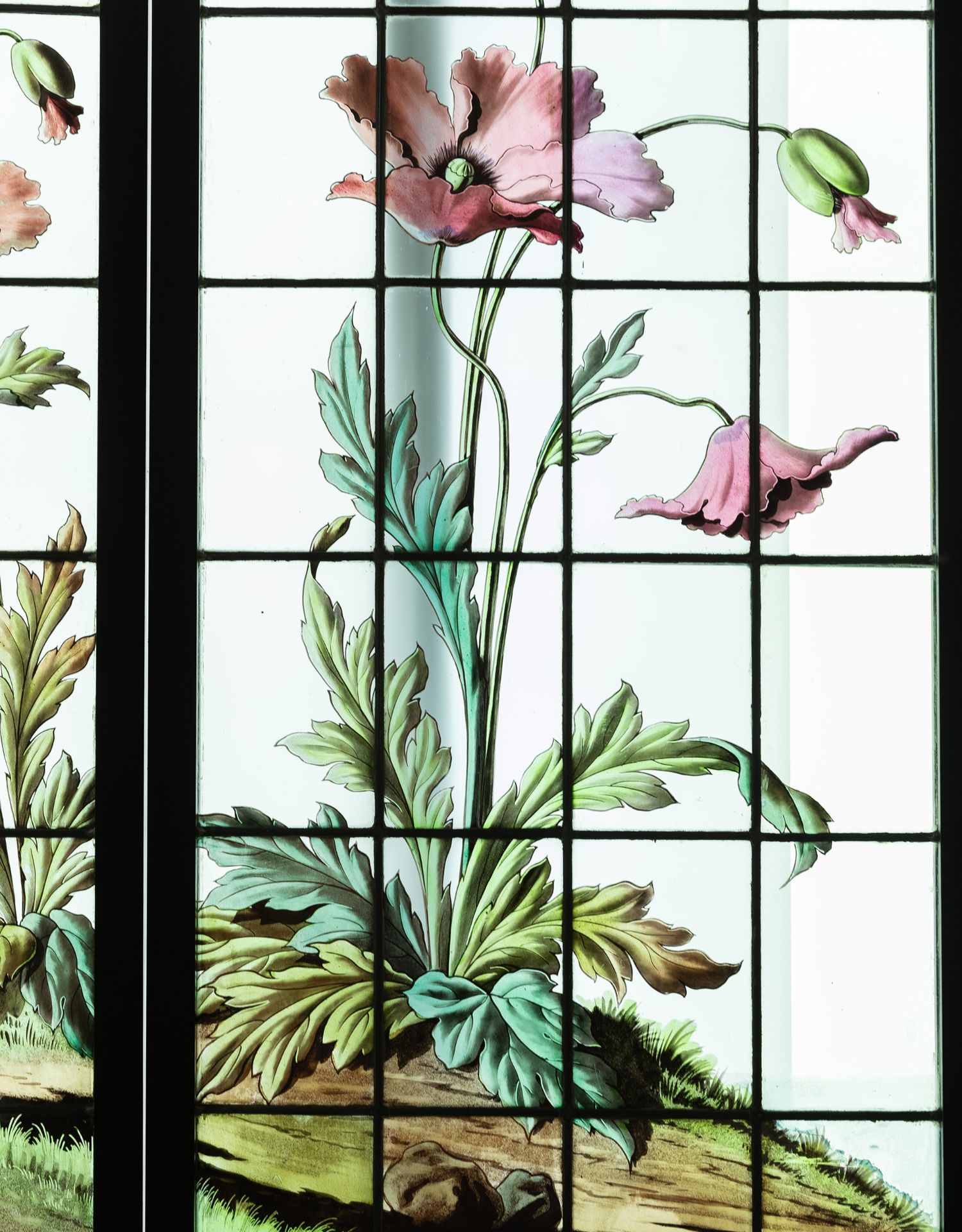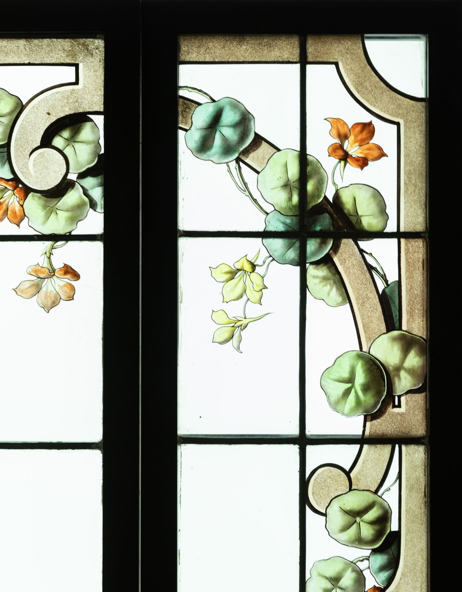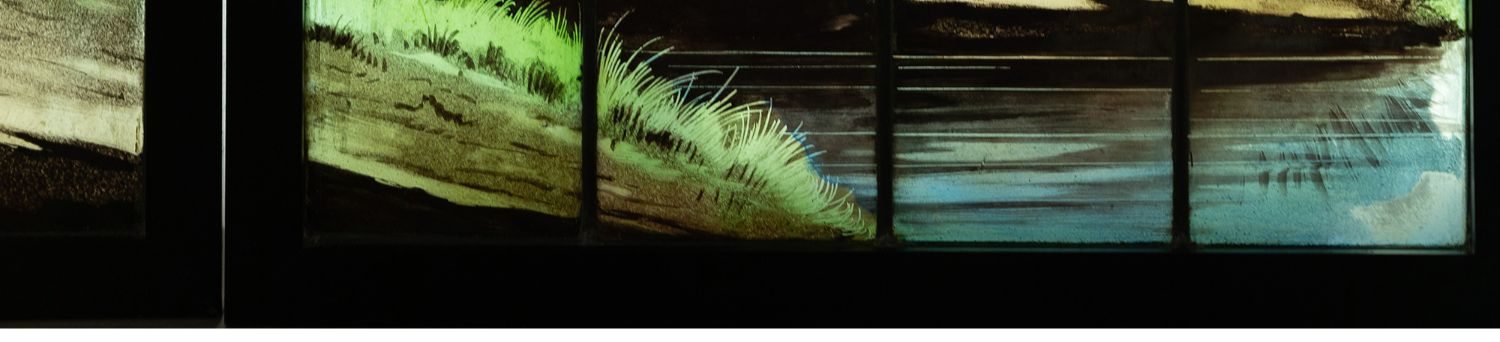 独角鹿西洋古董法国新艺术时期燕雀鸢尾水岸春绘玻璃花窗四件