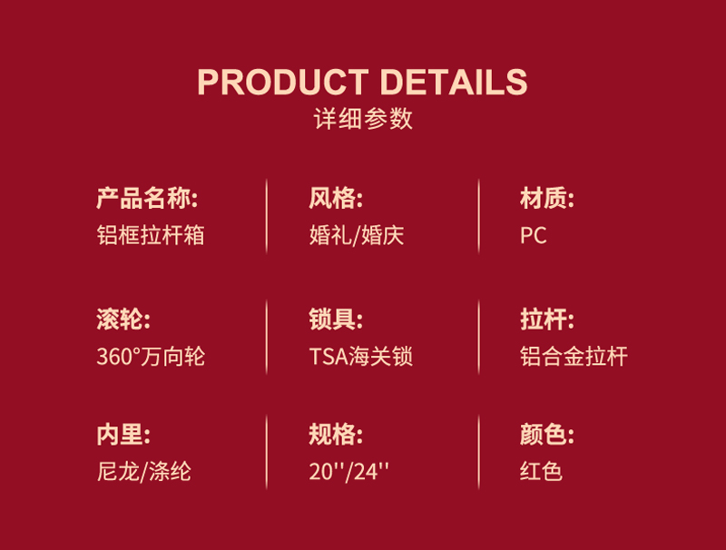结婚铝框行李箱红色婚礼用箱子拉杆箱新娘陪嫁皮箱女方嫁妆铝框密码箱