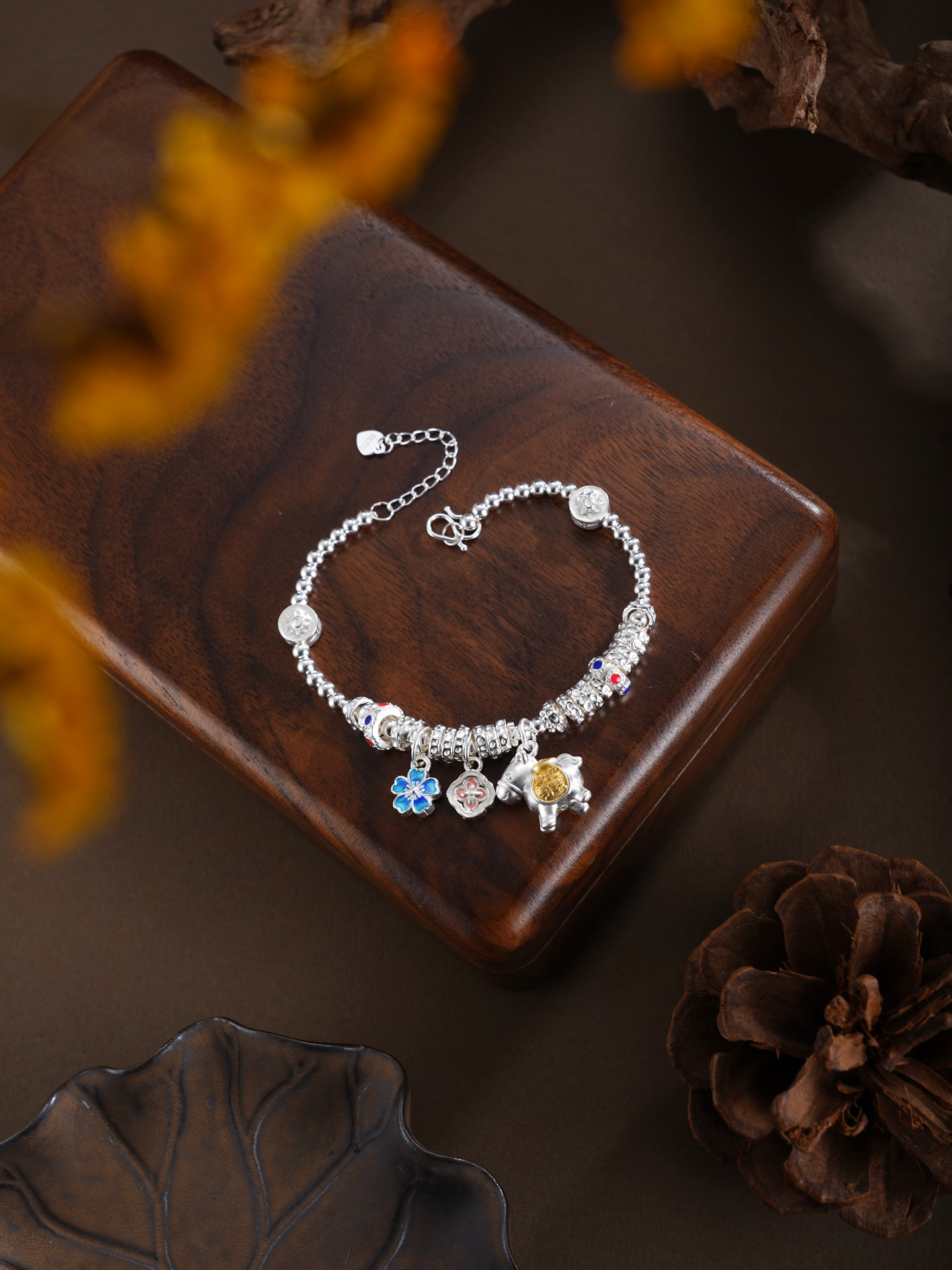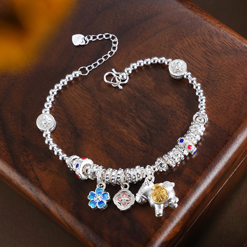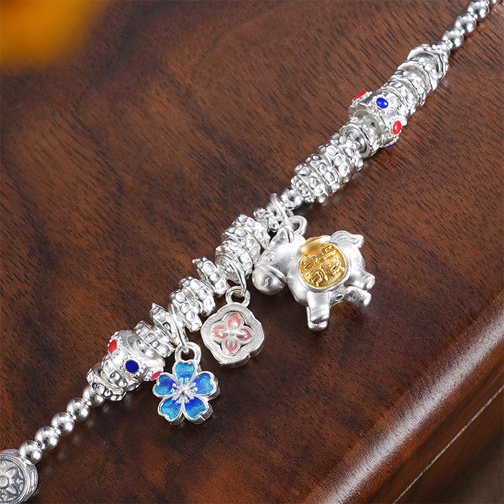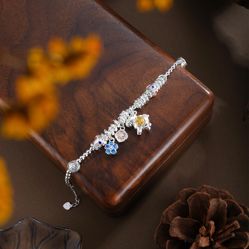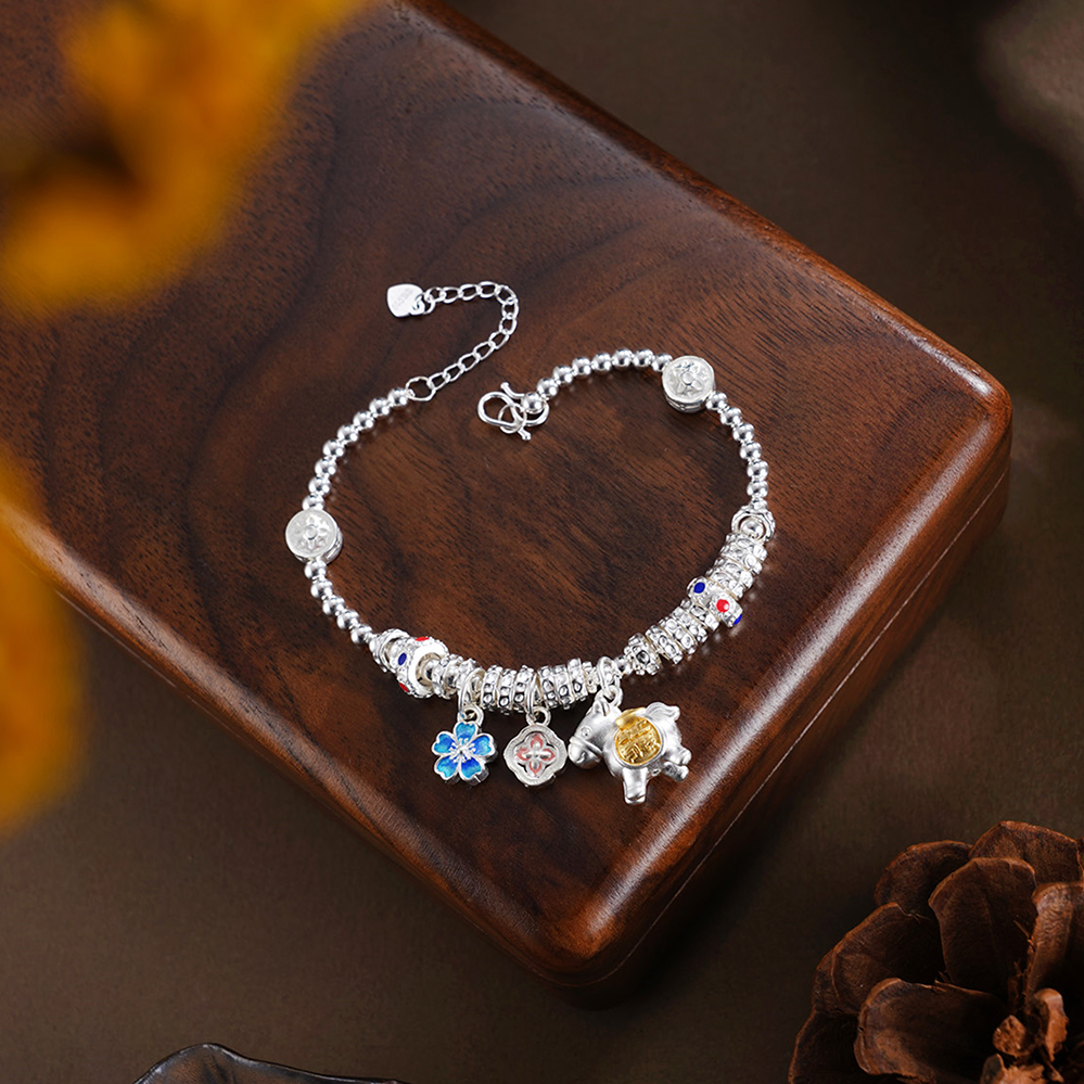 【寓意】:以纯银精铸手链,缀以萌趣小马,寓意生活如骏马欢腾、福运随行。搭配花朵坠饰,寓意事业繁盛、喜乐常伴。