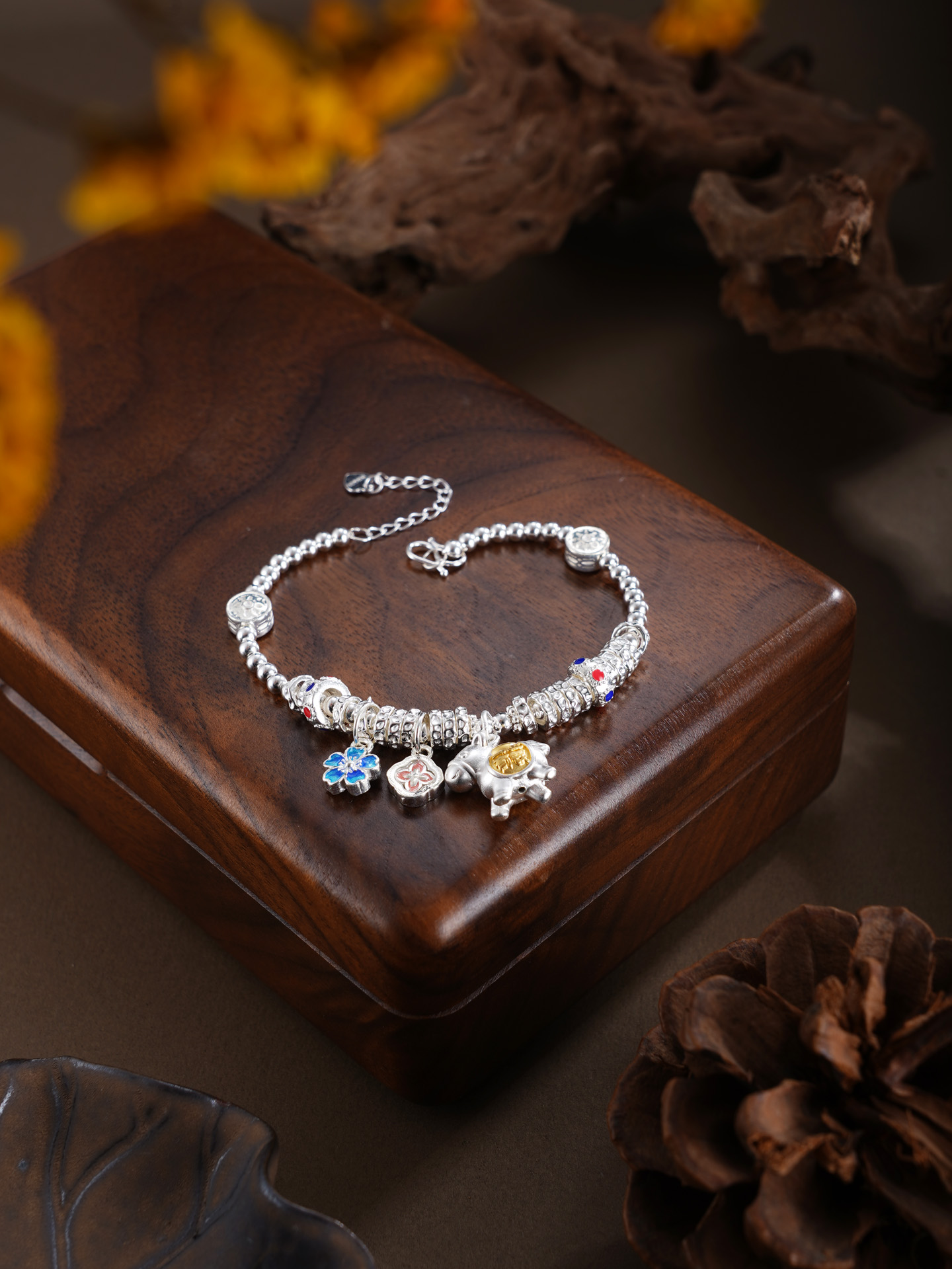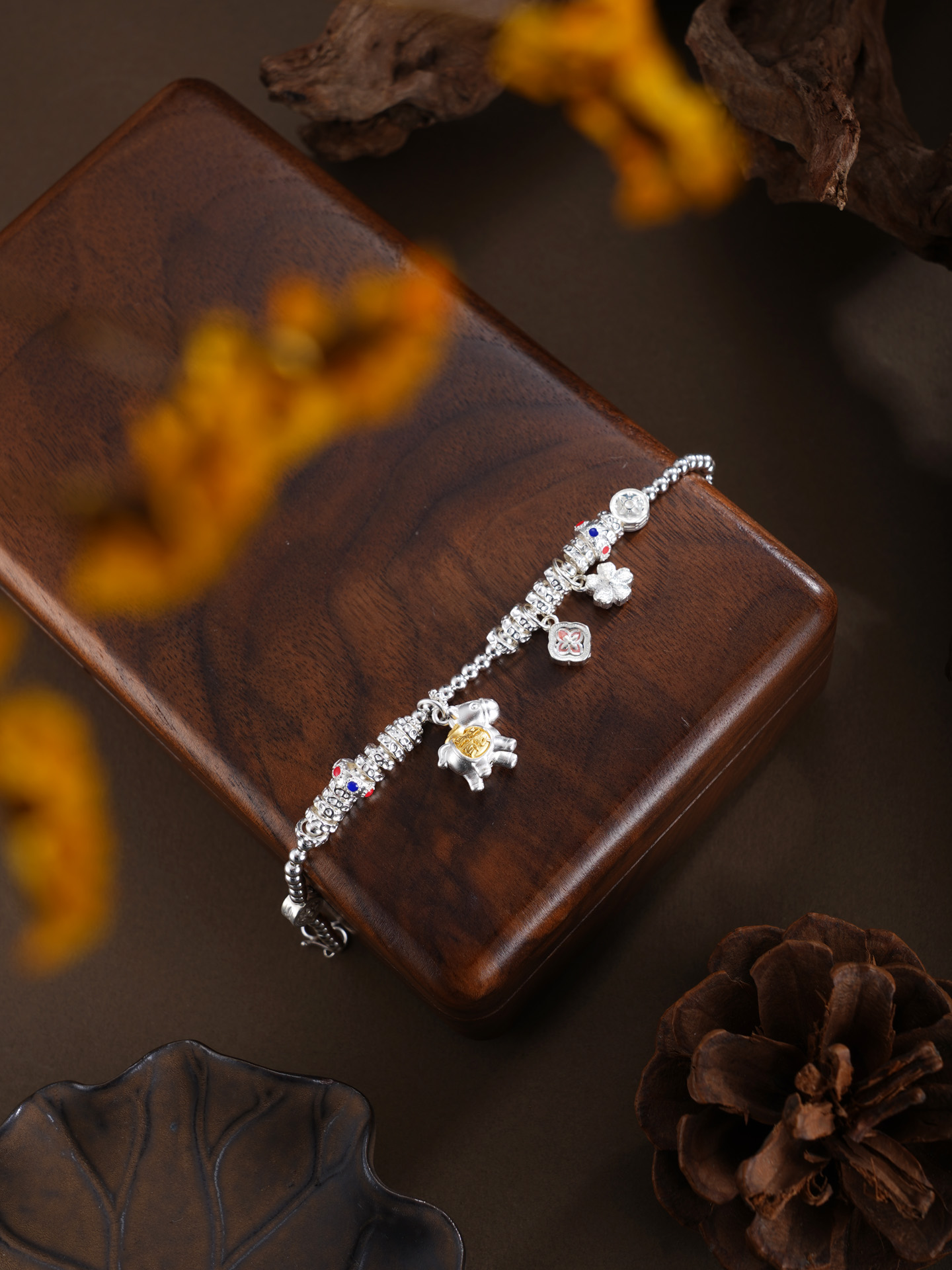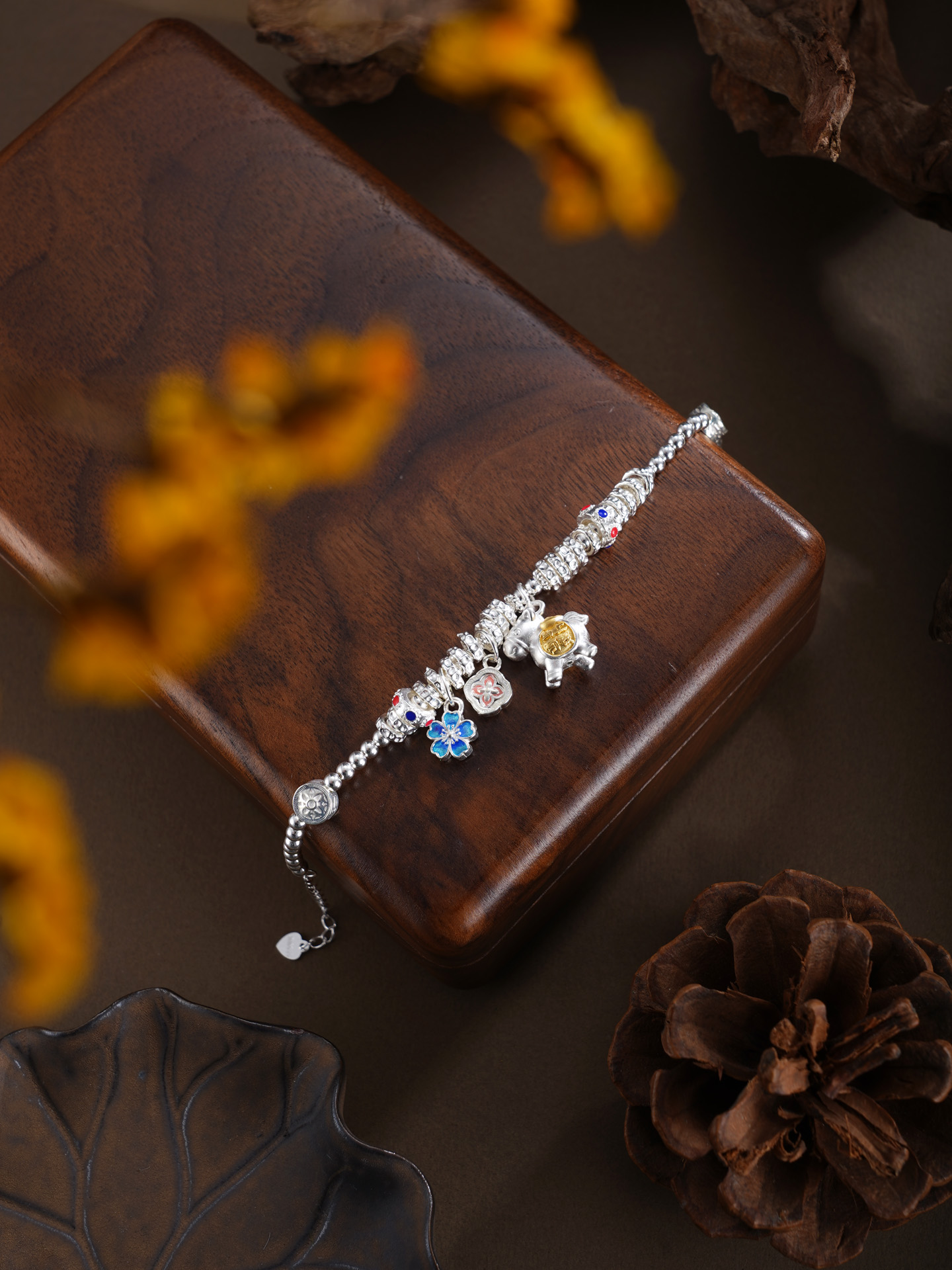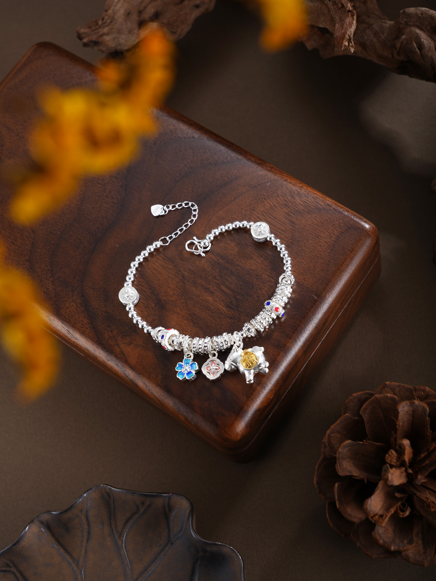 【寓意】:以纯银精铸手链,缀以萌趣小马,寓意生活如骏马欢腾、福运随行。搭配花朵坠饰,寓意事业繁盛、喜乐常伴。