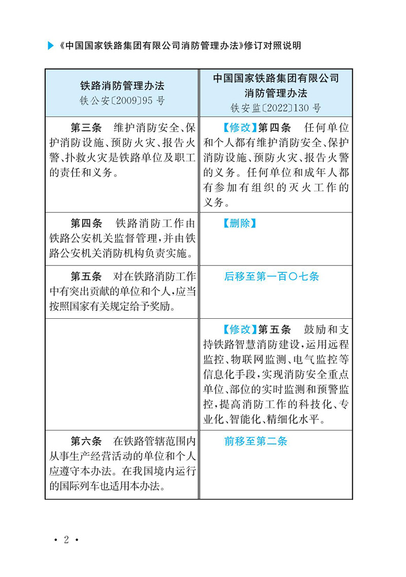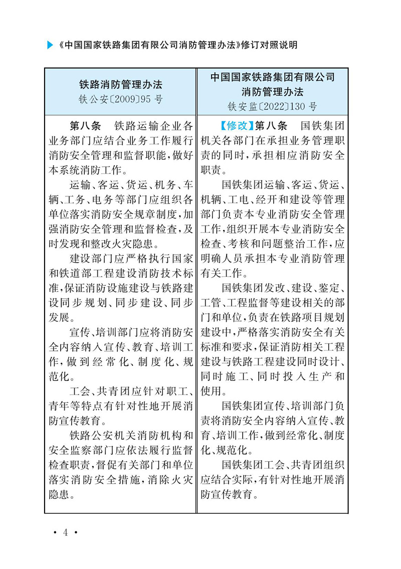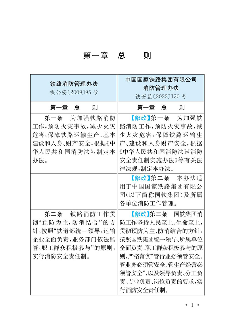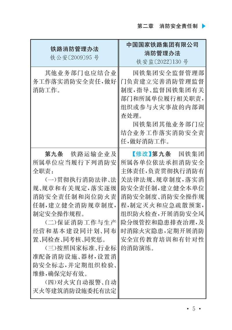 本书是国铁集团铁安监【2022】130号文件《国铁集团消防管理办法》与替代的旧版规章铁公安【2009】95号文件《铁路消防管理办法》的对照说明。新版《办法》基本保持了原《办法》的基本框架。在原《办法》98条的基础上,新增33条,删除15条,修改74条,维持8条,共计六章115条。在章节结构上增加了第二章“消防安全责任制”和第三章第七节“其他重点场所防火”,进一步明确国铁集团机关各部门、所属各单位职责和重点场所防火要求;在火灾预防方面也结合实际进行了补充完善,主要修订内容如下:(一)调整了办法适用范围。(二)明确了消防安全责任。(三)明确了铁路建设项目消防安全管理要求。(四)修订了火灾预防方面部分条款内容。(五)修订了监督检查方面部分条款内容。