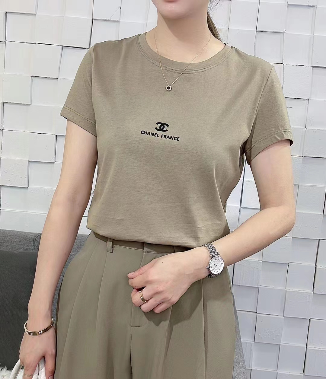 T8837 # 卡其 M-L 圆领字母刺绣短袖T恤 百搭显瘦时尚休闲洋气