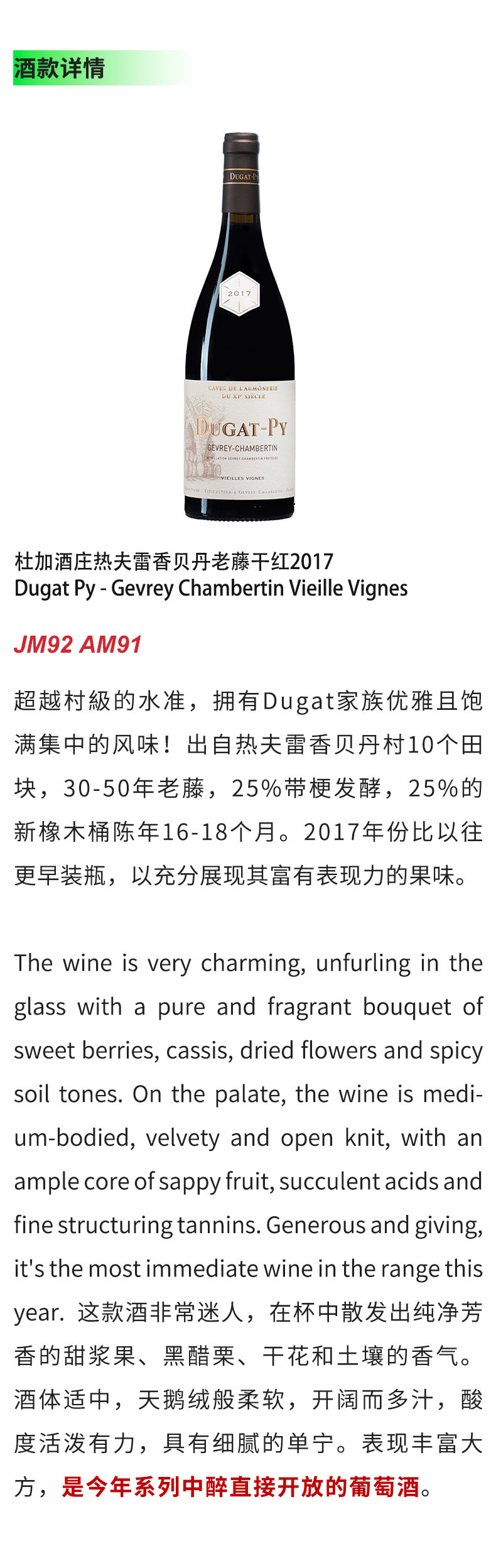 【跨境现货好价】杜加酒庄热夫雷香贝丹村级老藤干红2016/2017