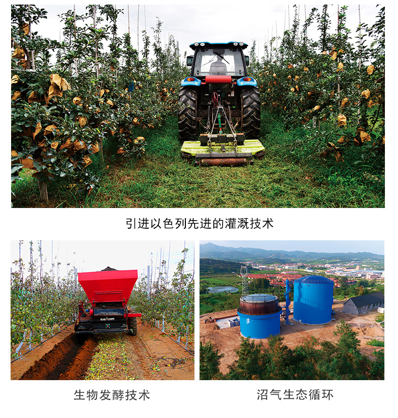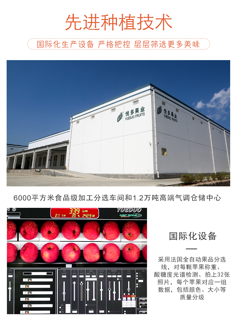 跟我们走进2300亩现代化自有果园,从以色列引入了水肥一体化的滴灌设备;从法国引入了Maf Roda全自动苹果智能分选设备;从美国引入了smartfresh保鲜技术,365天新鲜供应。