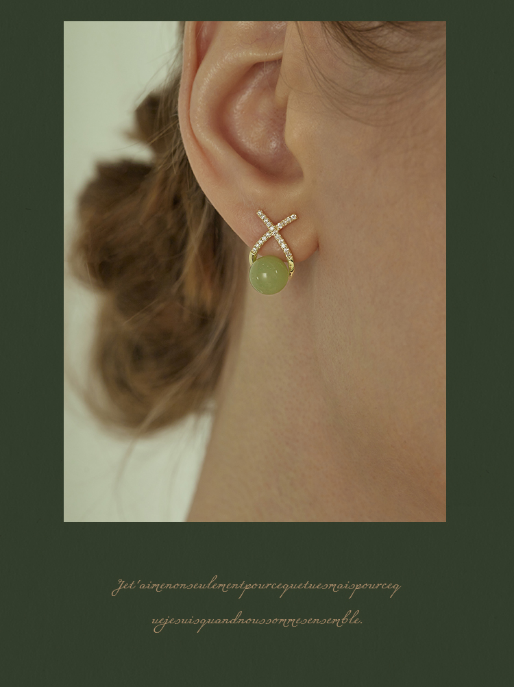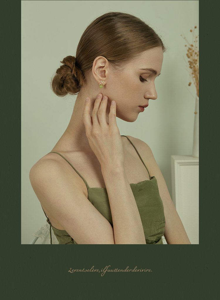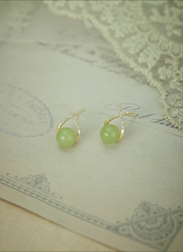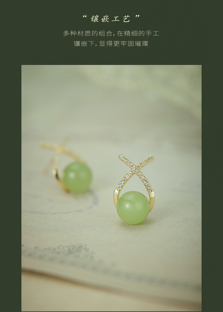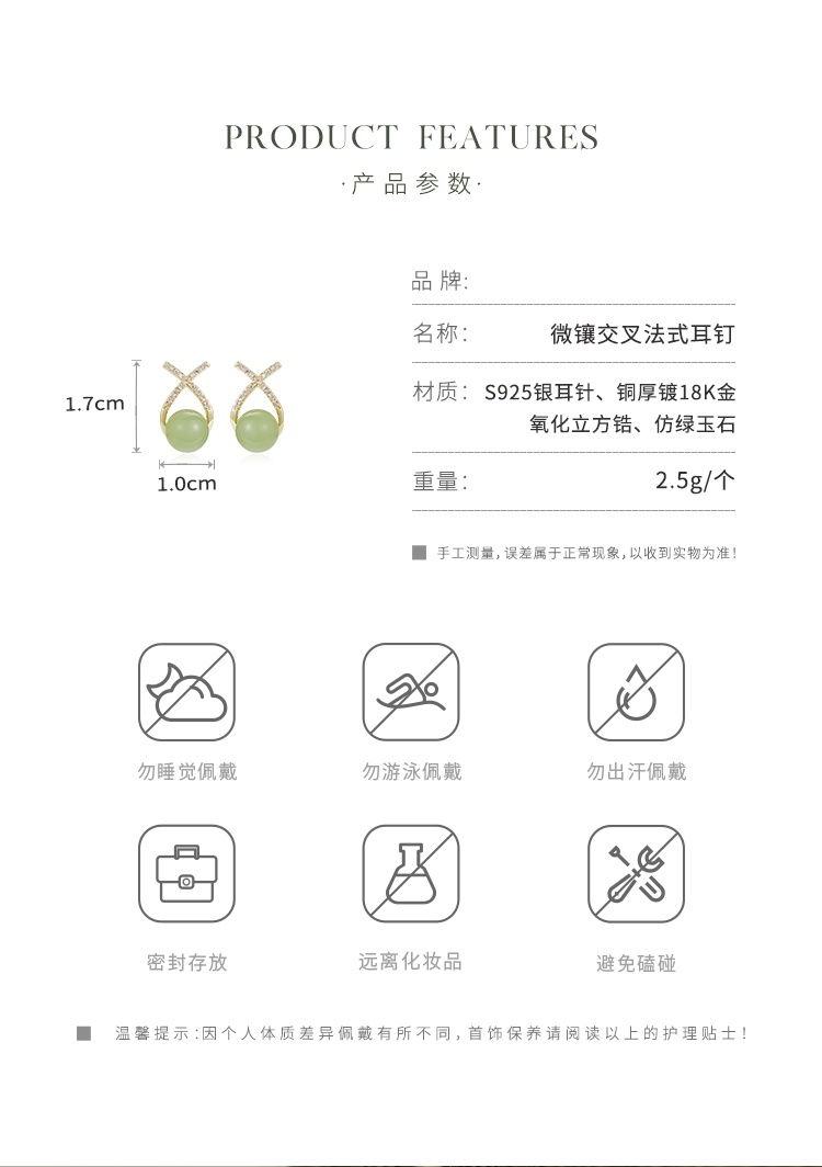 Oflye潮流饰品 微镶交叉仿绿玉石耳钉女款2024新款轻奢耳环