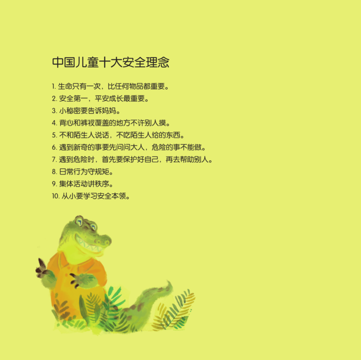 《中国儿童十大安全理念绘本》是在广泛征求幼儿教育专家、幼儿园教师和家长意见的基础上,邀请国内绘本作家为儿童创作的安全应急题材绘本。该系列共有10册,每册通过一个精彩的故事向儿童阐述一个保护自身安全的理念。10个故事与国内提出的“中国儿童十大安全理念”分别对应。