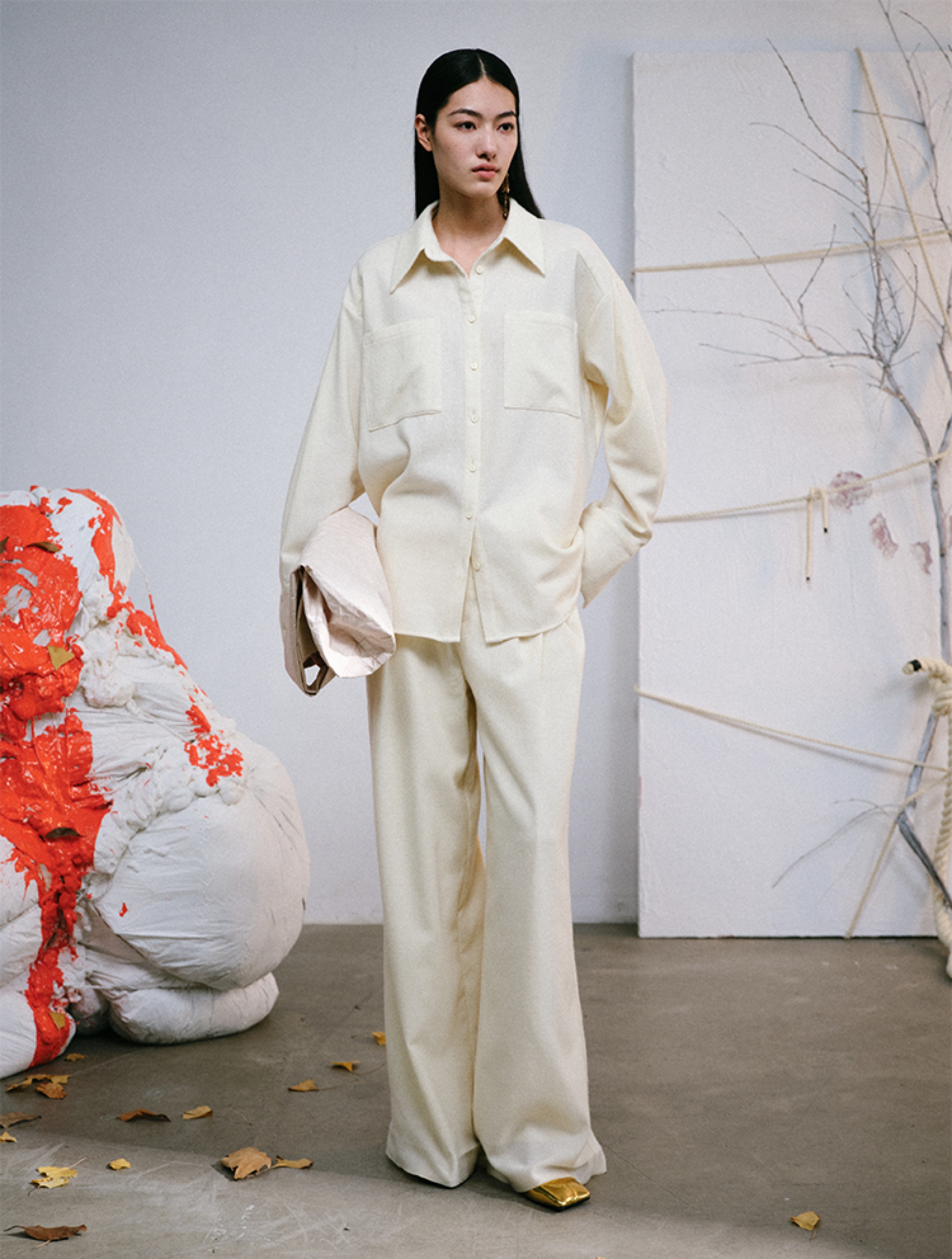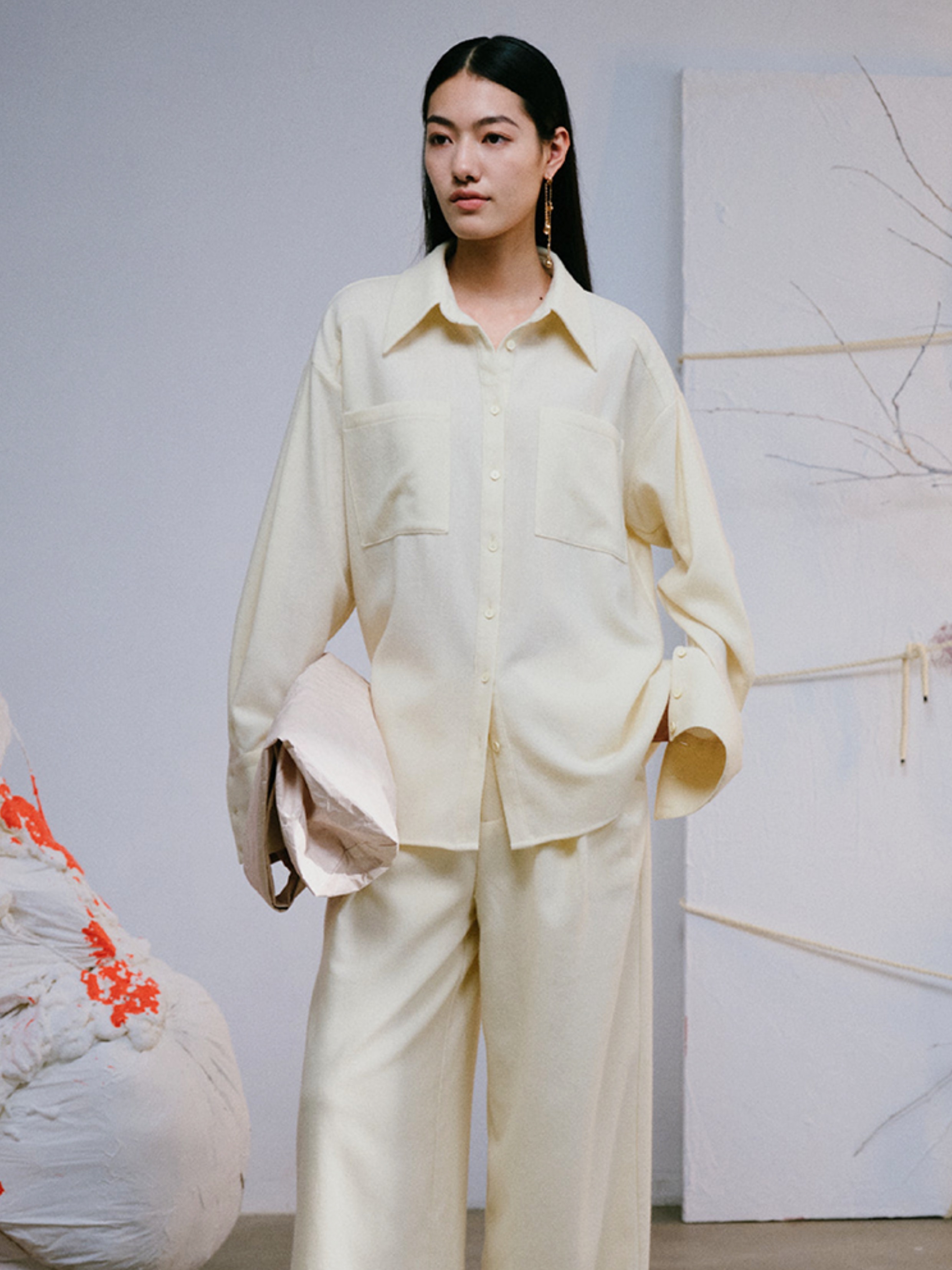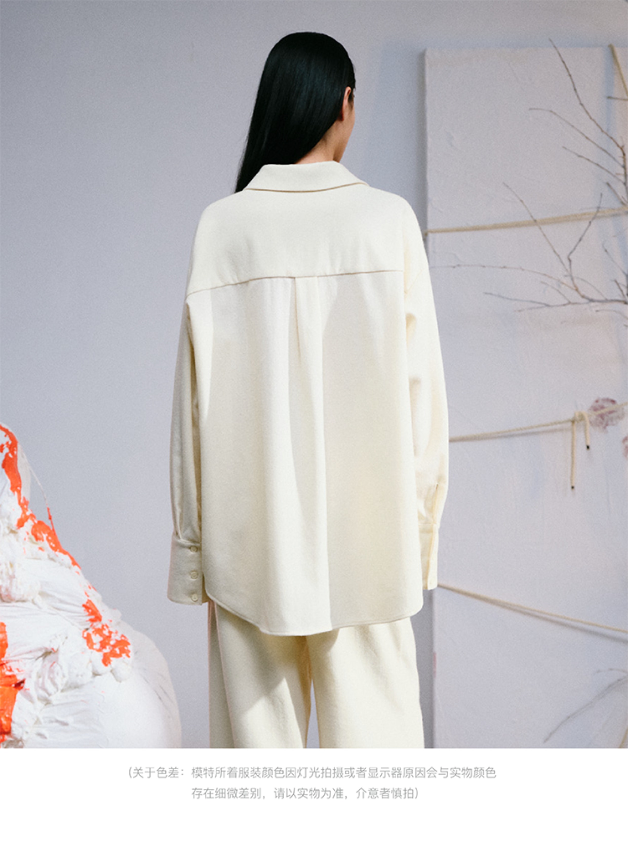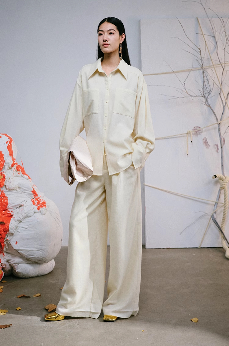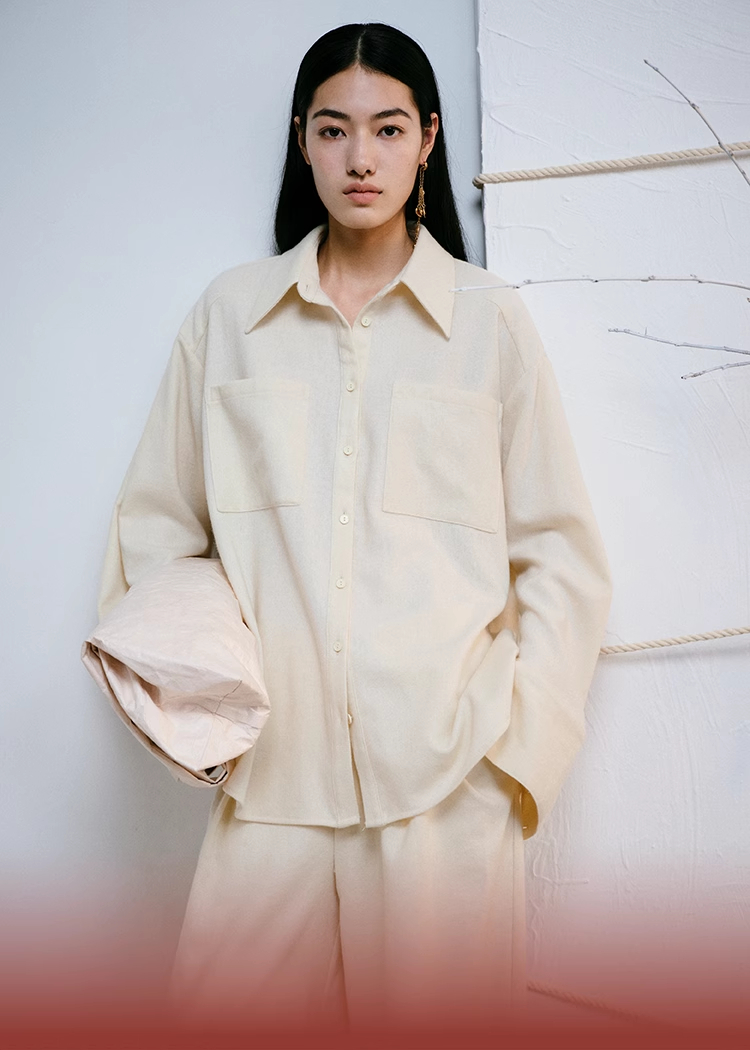 LIYIHAN 进口面料24秋绵羊毛刺绣衬衫长袖落肩女款简约宽松高级感