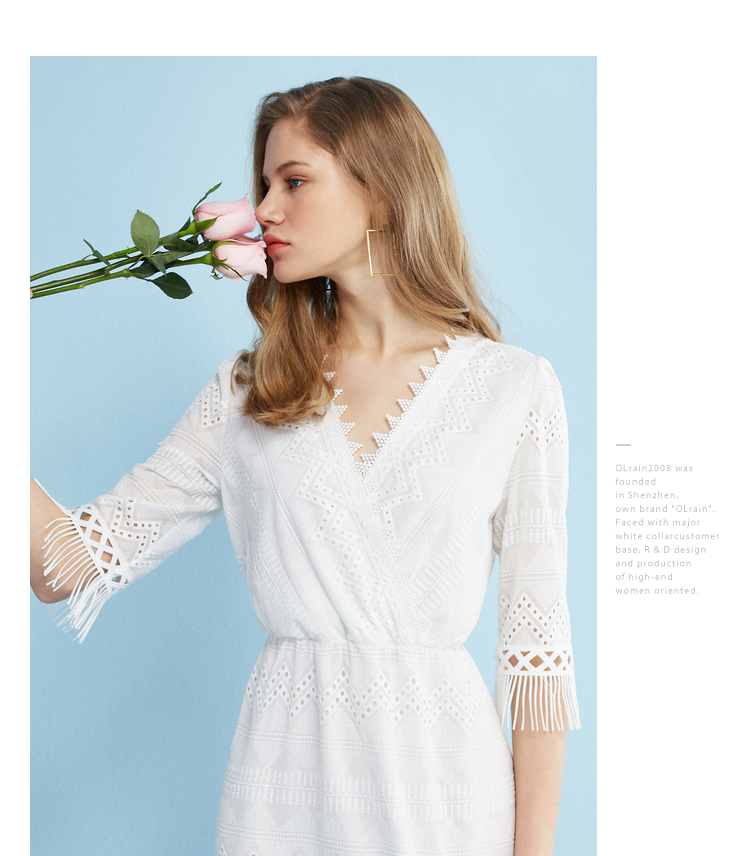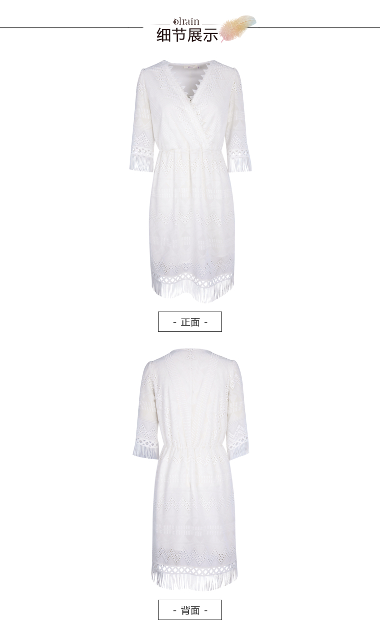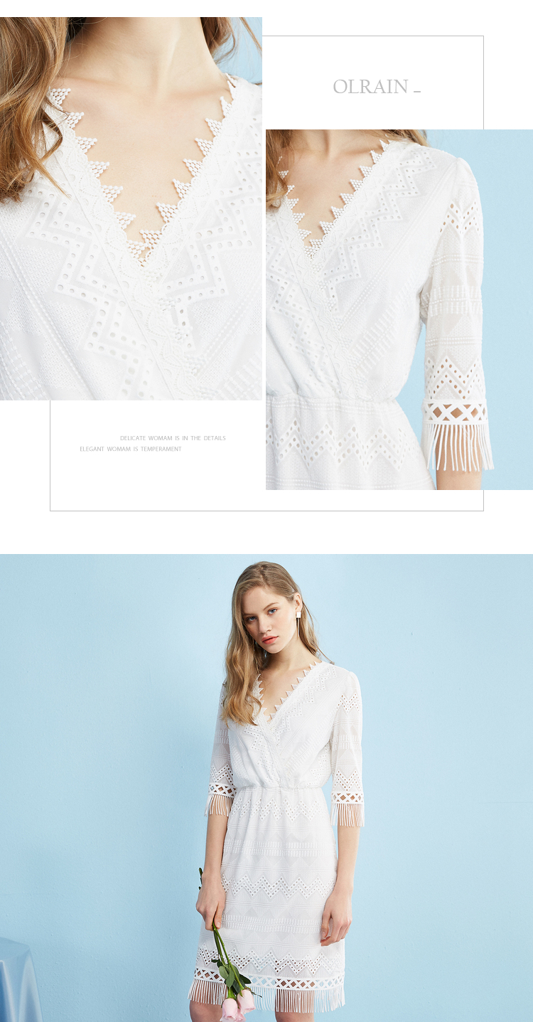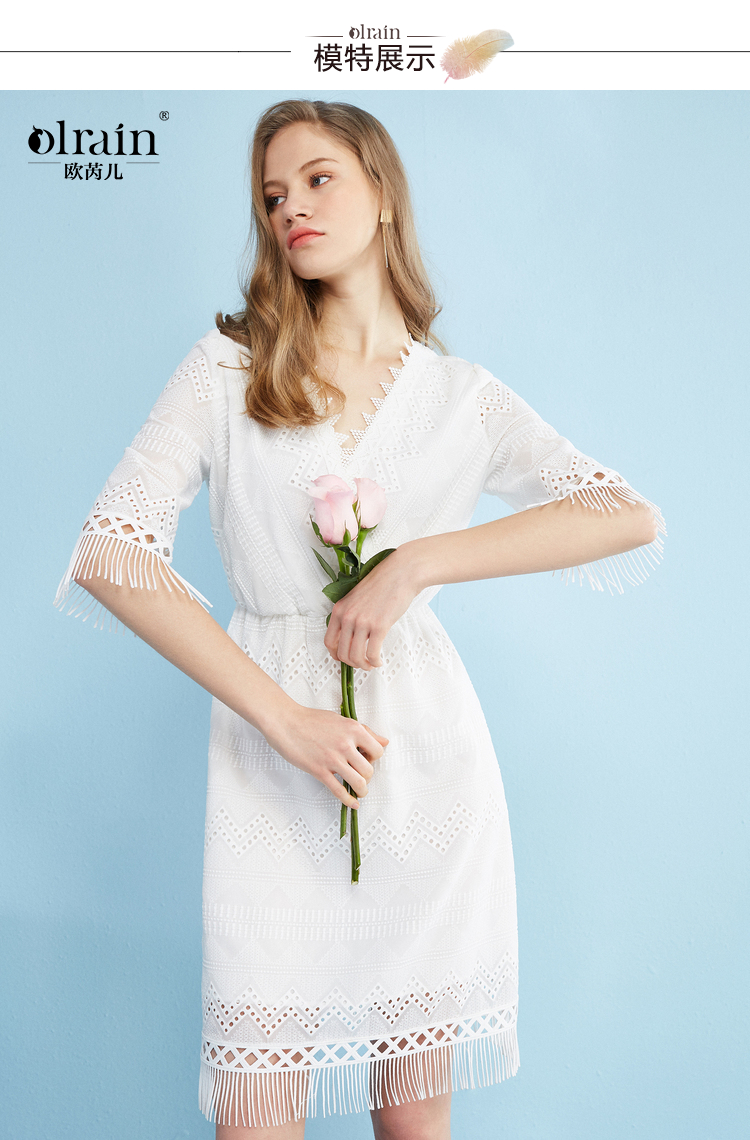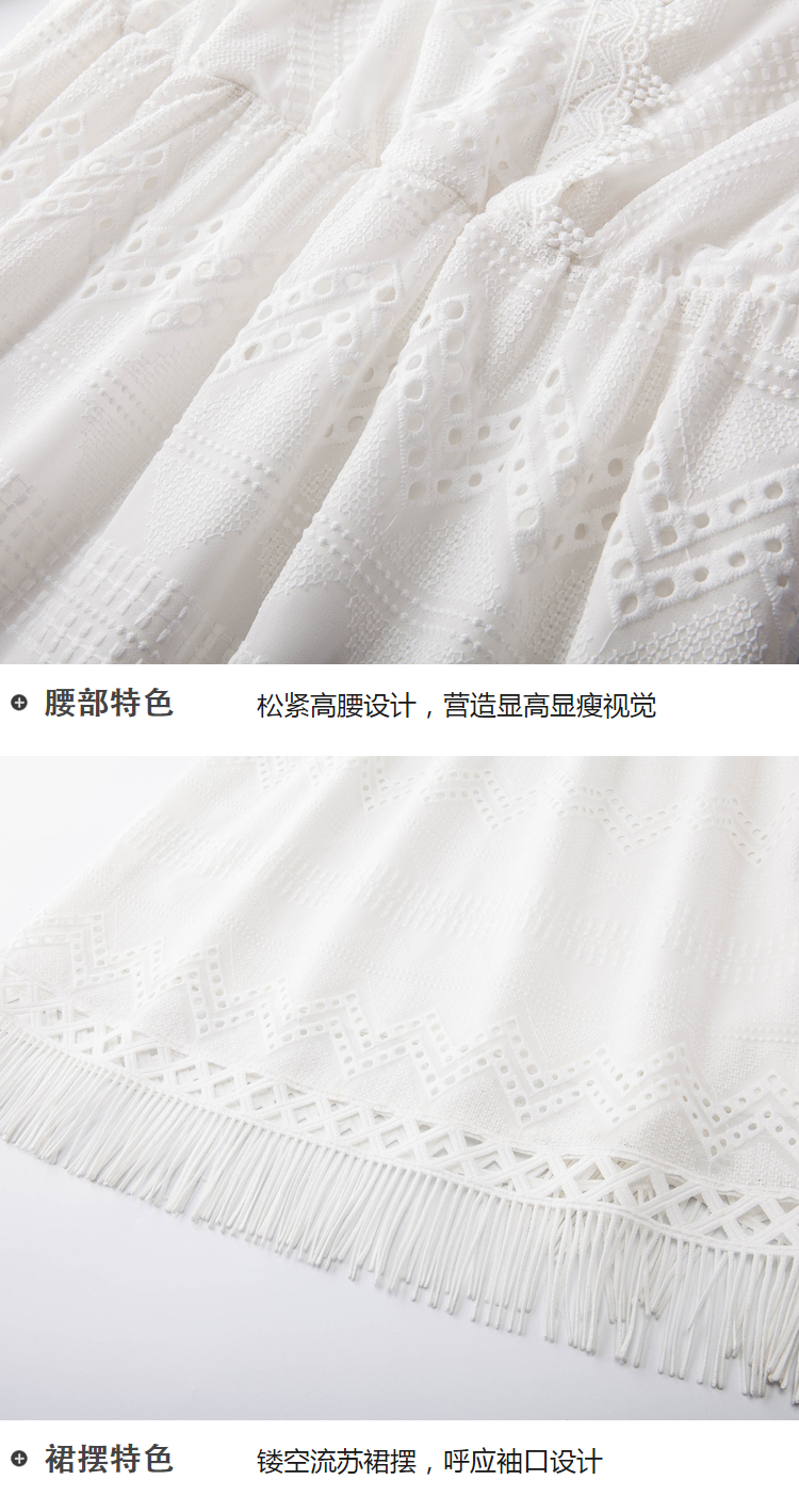 欧芮儿欧芮儿 2018夏收腰镂空流苏V领白色蕾丝连衣裙女中长款