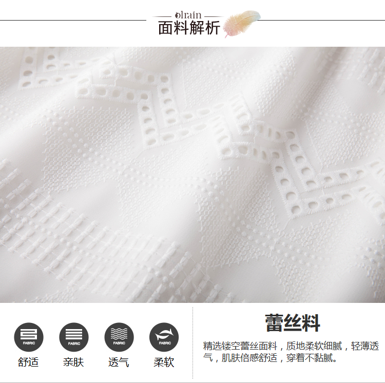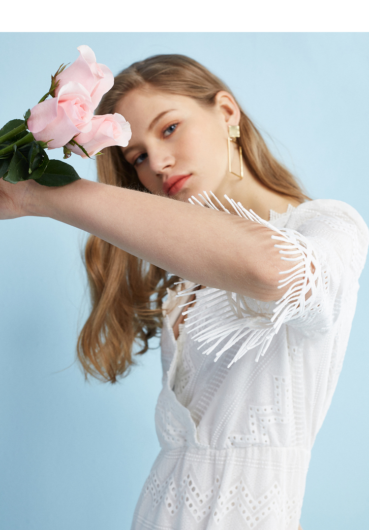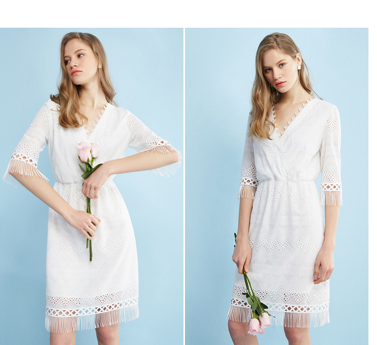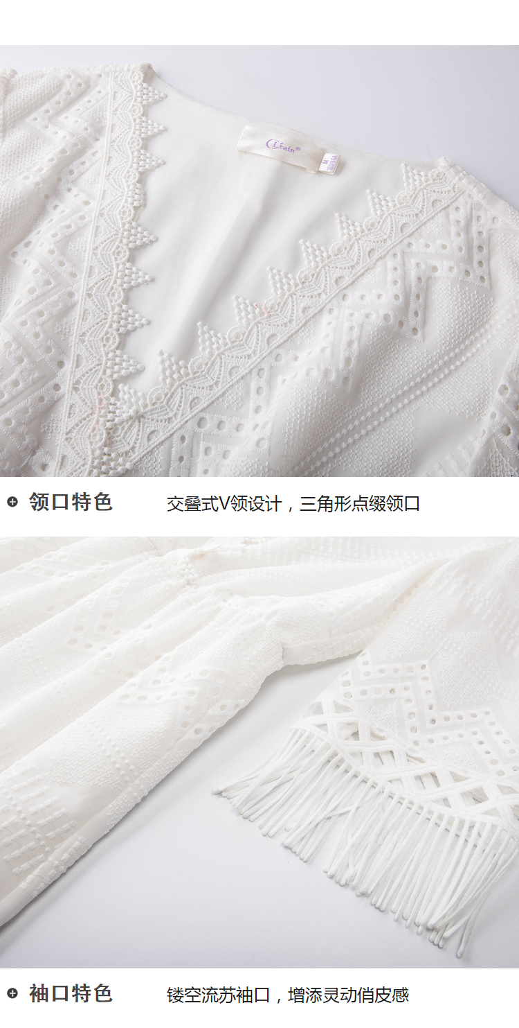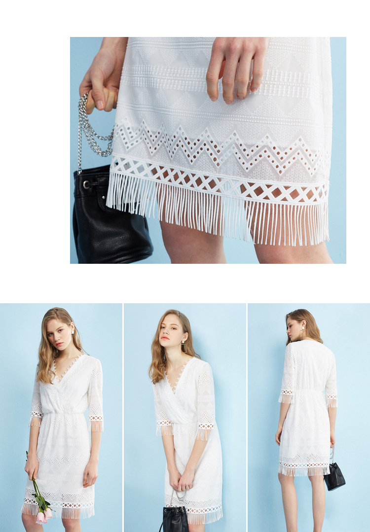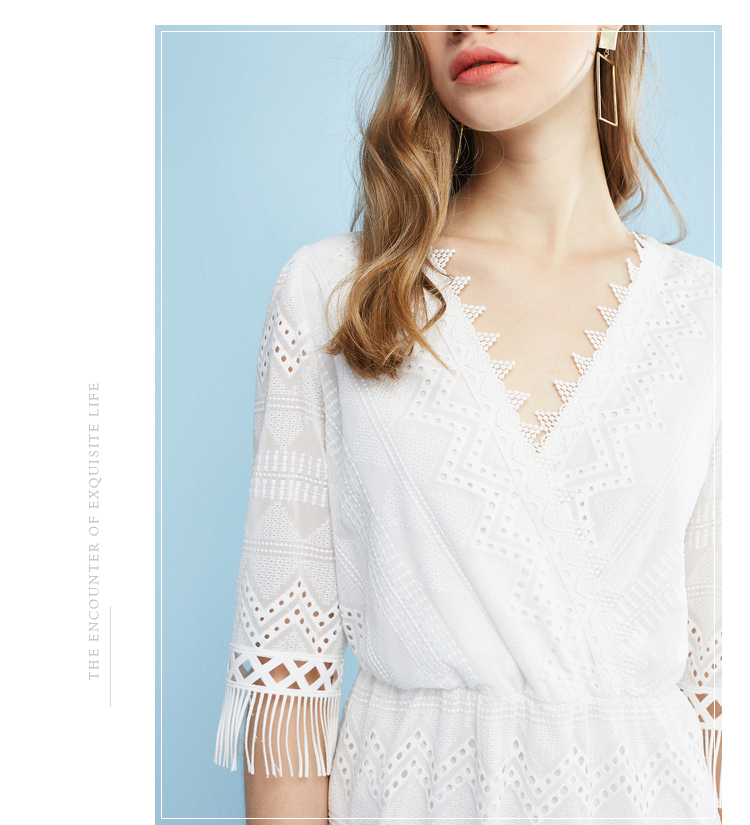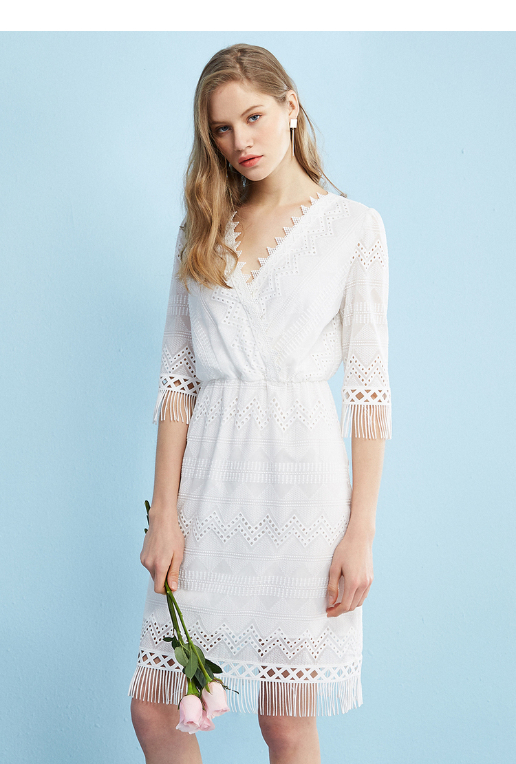 欧芮儿欧芮儿 2018夏收腰镂空流苏V领白色蕾丝连衣裙女中长款