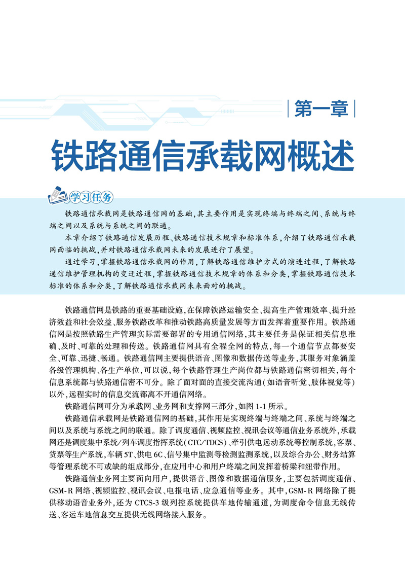 《铁路通信承载网》为“铁路专业系列教材”之一,全书主要内容包括:通信机房、通信交直流供电系统、光缆线路、传输网、数据通信网、通信防雷与接地等。全书根据职业教育特色,在每章开头设置了学习任务,每章末尾设置了复习思考题,便于学生理解、巩固所学内容。每章均设置有典型的故障案例。