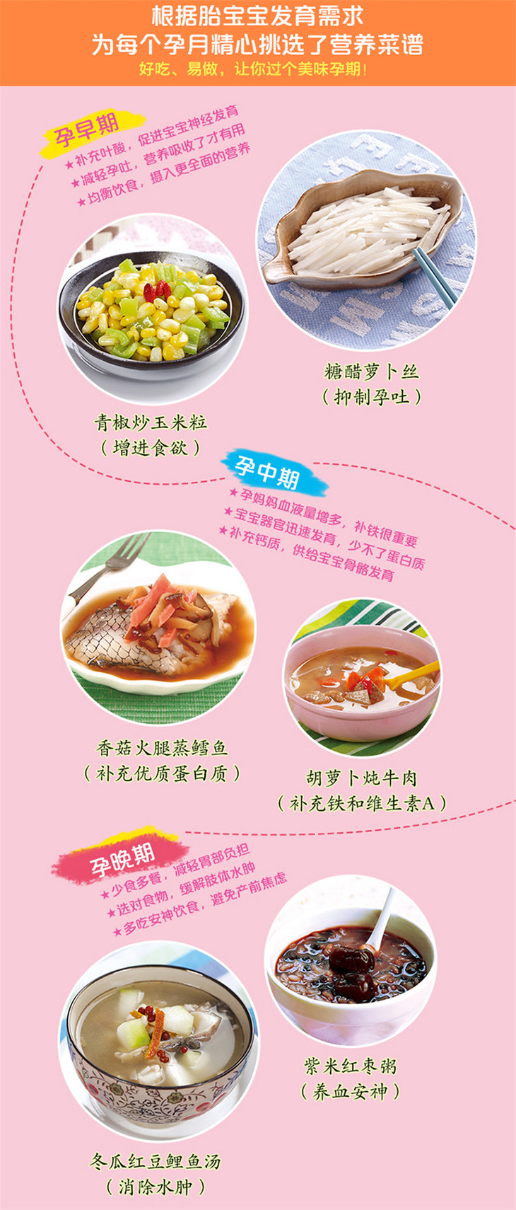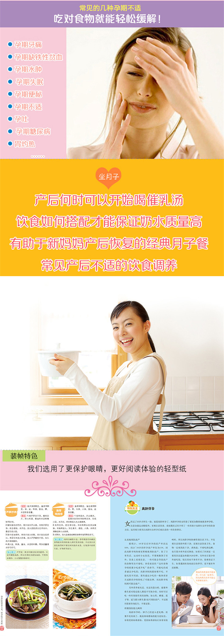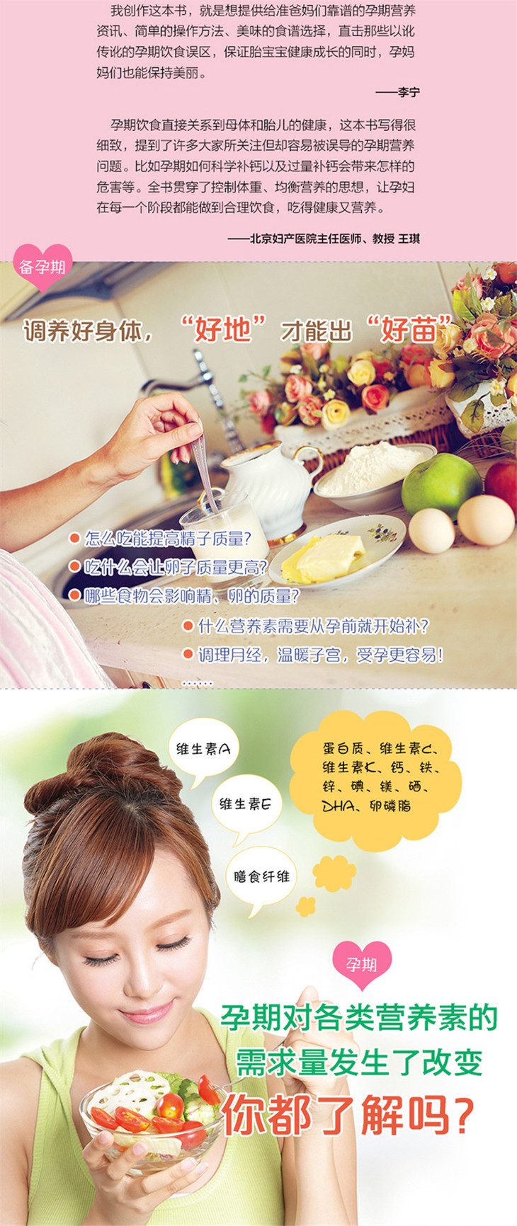 我们组织《协和医院营养专家:怀孕吃什么养胎》时,一直秉承着以下初衷来为准父母们提供有咨询:1.专业——根据不断阶段胎儿成长所需关键营养素和不同孕期准妈妈可能面临的不适甚至疾病,提供科学的营养配餐和饮食解决方案;2.实用——选取容易购买的食材,贴心的食谱,图文配合,让年轻的读者们一学就会;3.牢记“美丽”才是女性永恒的追求——即使即将身为人母,即使为了孩子你们愿意暂时放弃打扮自己,但是我们时刻谨记帮助你在长胎时不长肉,帮助你产后更快恢复形体。