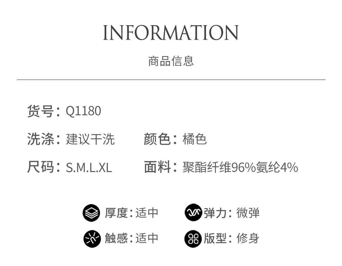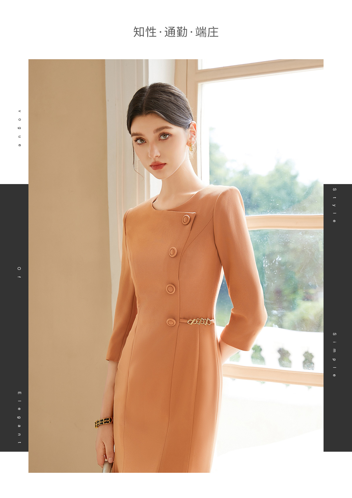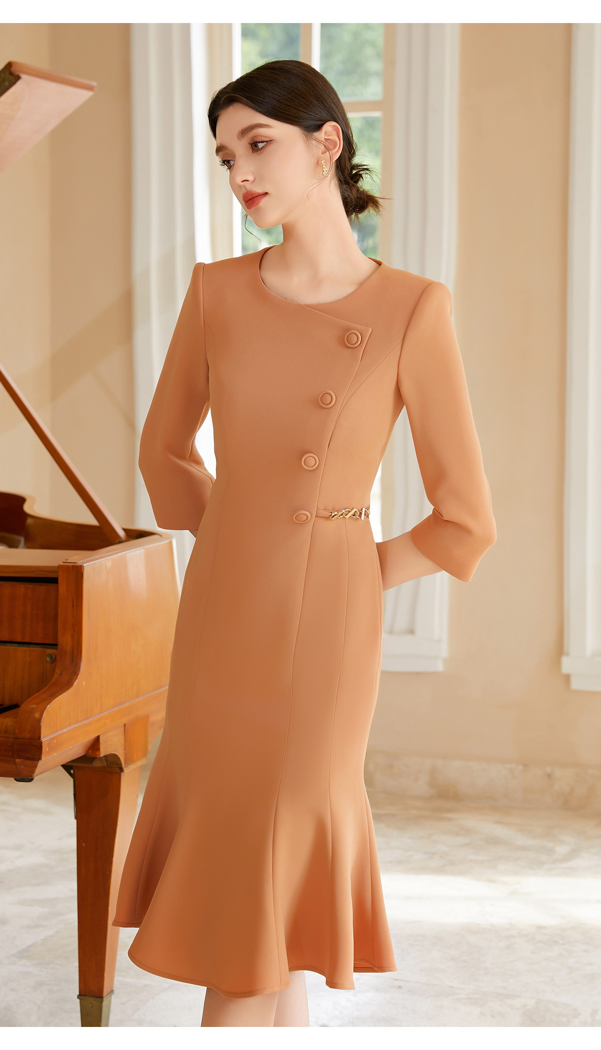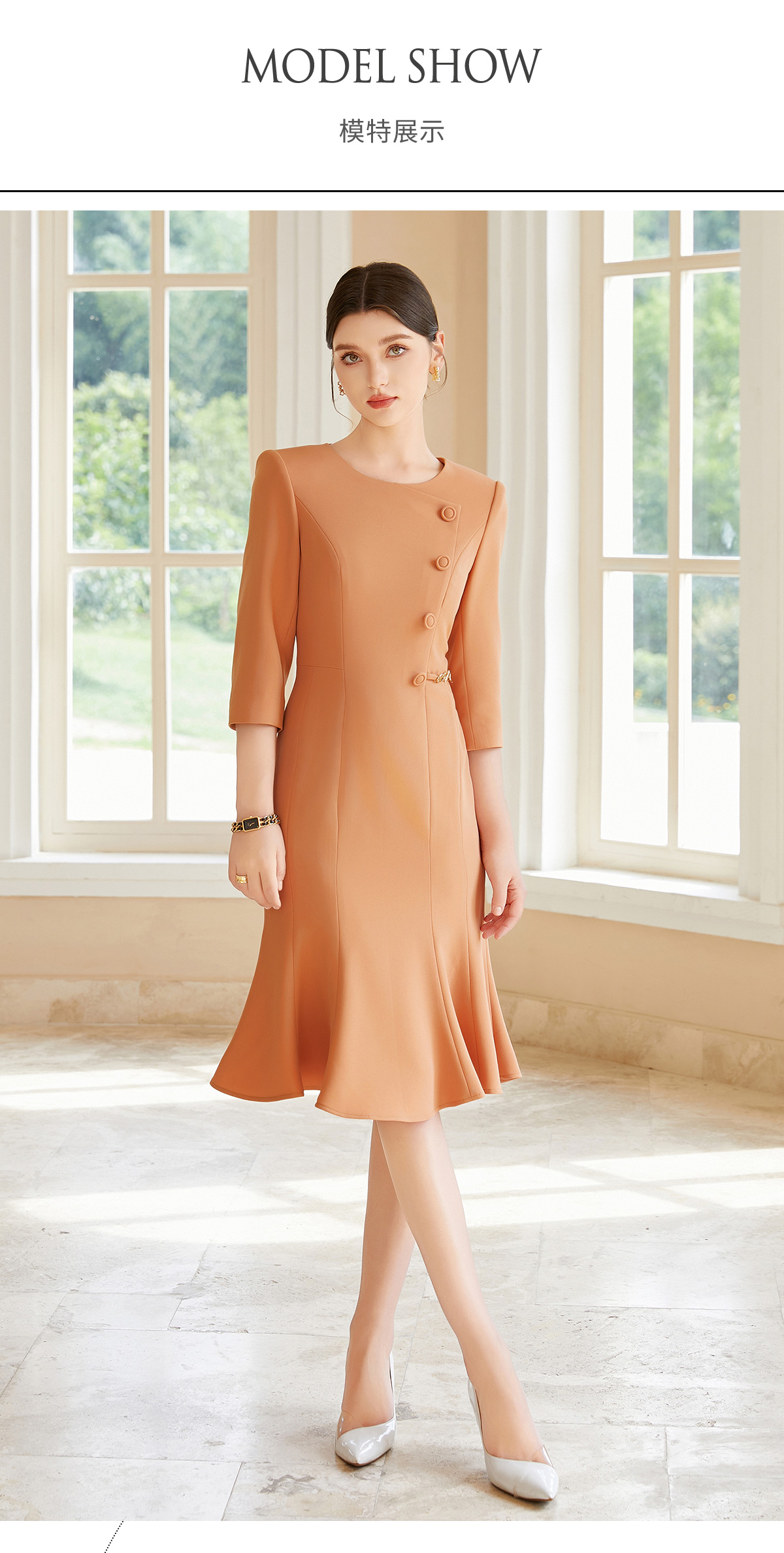 IWY/橘红色七分袖时尚高端圆领连衣裙女收腰显瘦包臀鱼尾裙职业裙Q1180