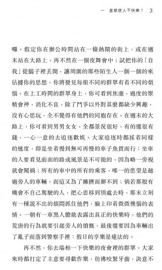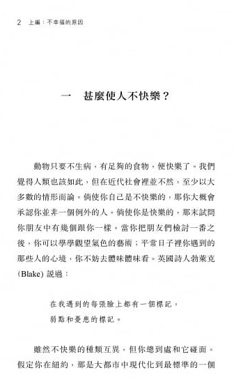 本書簡明扼要地分為「不幸福的原因」和「幸福的原因」兩大部分,直擊過度競爭、神經疲憊、自我耽溺、嫉妒、畏懼輿論等現代生活的常見病症,避開基於內疚的道德觀,為幸福生活開出了理性主義藥方,包括培養自身以外興趣的重要性和消極快樂的危險。沒有高深的學說,也沒有晦澀的理論,取而代之的是羅素自身的經驗和觀察,他相信那些感受到憂鬱之苦而不自溺於憂鬱的男女,能在此找到他們的病案和逃避之法。
