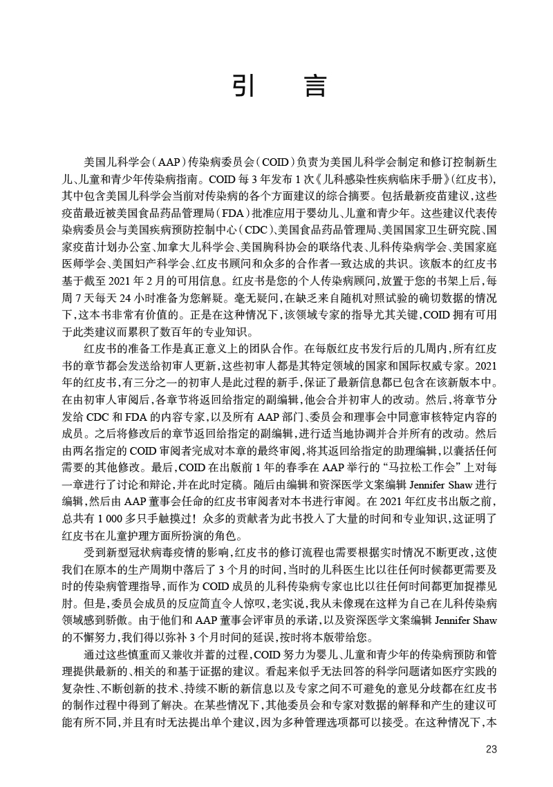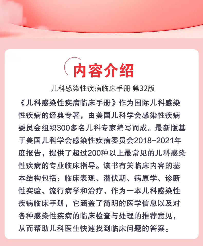 《儿科感染性疾病临床手册》作为国际儿科感染性疾病的经典专著,由美国儿科学会感染性疾病委员会组织300多名儿科专家编写而成。最新版基于美国儿科学会感染性疾病委员会2018-2021年度报告,提供了超过200种以上最常见的儿科感染性疾病的专业临床指导。该书有关临床内容的基本结构包括:临床表现、潜伏期、病原学、诊断性实验、流行病学和治疗,作为一本儿科感染性疾病临床手册,它涵盖了简明的医学信息以及对各种感染性疾病的临床检查与处理的推荐意见,从而帮助儿科医生快速找到临床问题的答案。