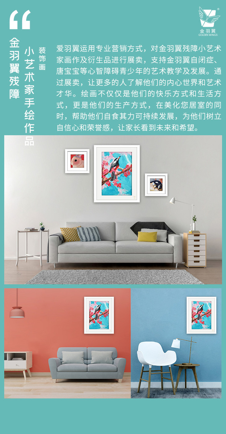 金羽翼将艺术与心理治疗相结合,用艺术教育的形式帮助残障青少年体现自身价值、提高生活质量、实现艺术梦想,并将绘画作品开发成衍生品销售,收入扣除成本后,20%返还给学员家庭,80%用于金羽翼艺术康复教学。