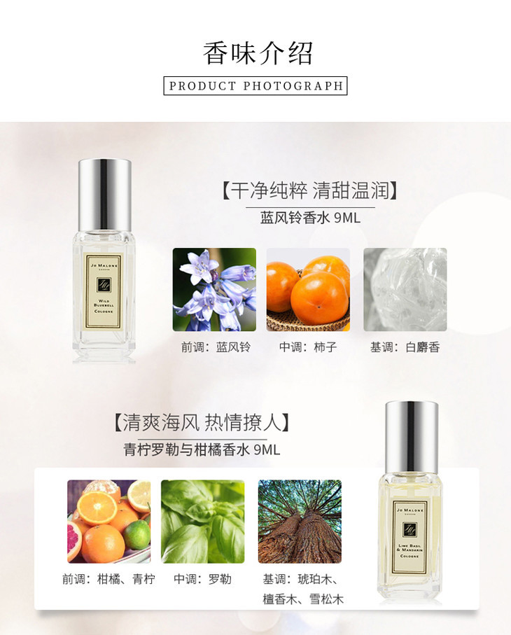 祖玛珑香型:香型:蓝风铃9ml+橙花9ml+青柠罗勒与柑橘9ml+英国梨与小苍兰9ml+黑莓与月桂叶9ml