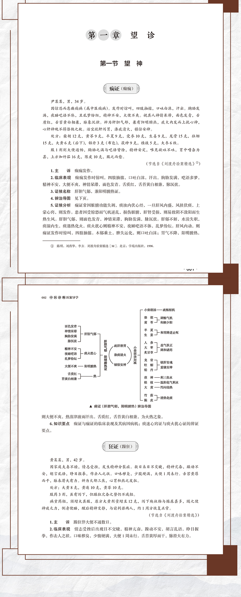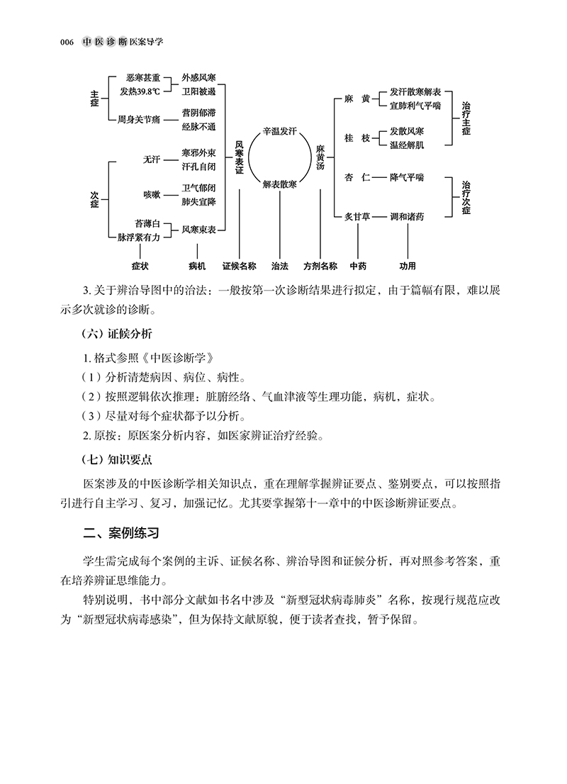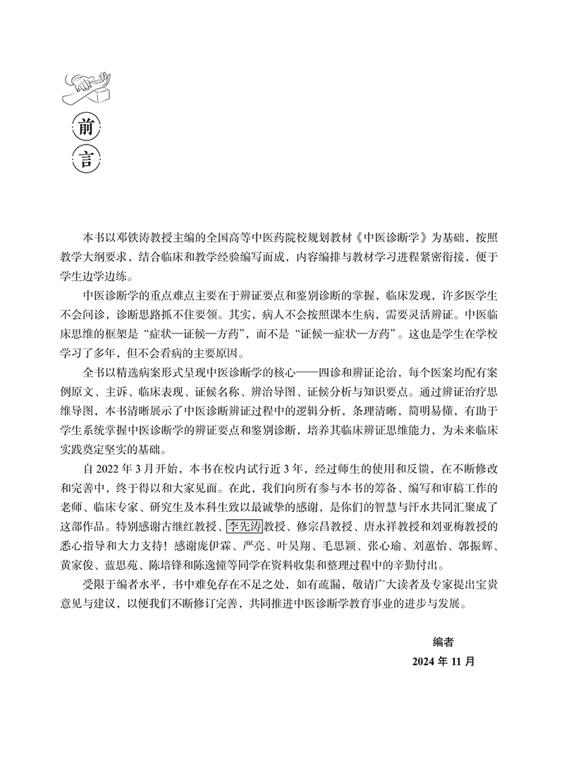 本书以邓铁涛主编的《中医诊断学》全国高等中医药院校规划教材为基础,按照教学大纲要求,结合临床和教学经验进行编写。 全书共分为10章,以教材中望诊、闻诊、问诊、切诊、八纲辨证、气血津液辨证、脏腑辨证、其他辨证(六经辨证、卫气营血辨证、三焦辨证)、临床拓展等各项中医诊断理论技术为抓手,从名医名家诊治精要及编者的临床实践中精选出典型、特色医案加以阐发,每个医案均配有原文、主诉、临床表现、辨治导图、证候分析和知识要点。其中,辨治导图按照“症状—证候—方药”的临床思路整合,条理清晰,简明易懂,有助于帮助学生系统掌握中医诊断学的核心内涵,为临床打下坚实的基础。