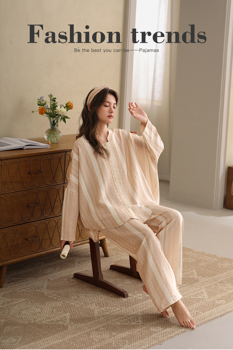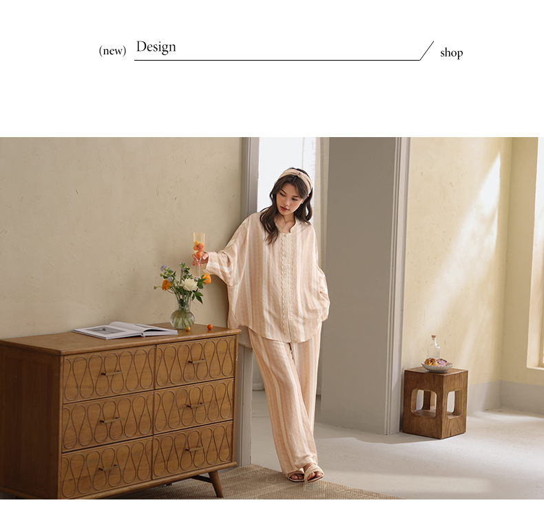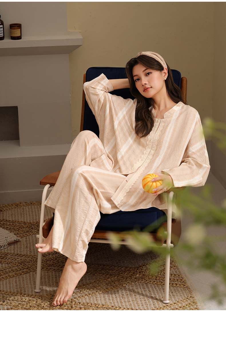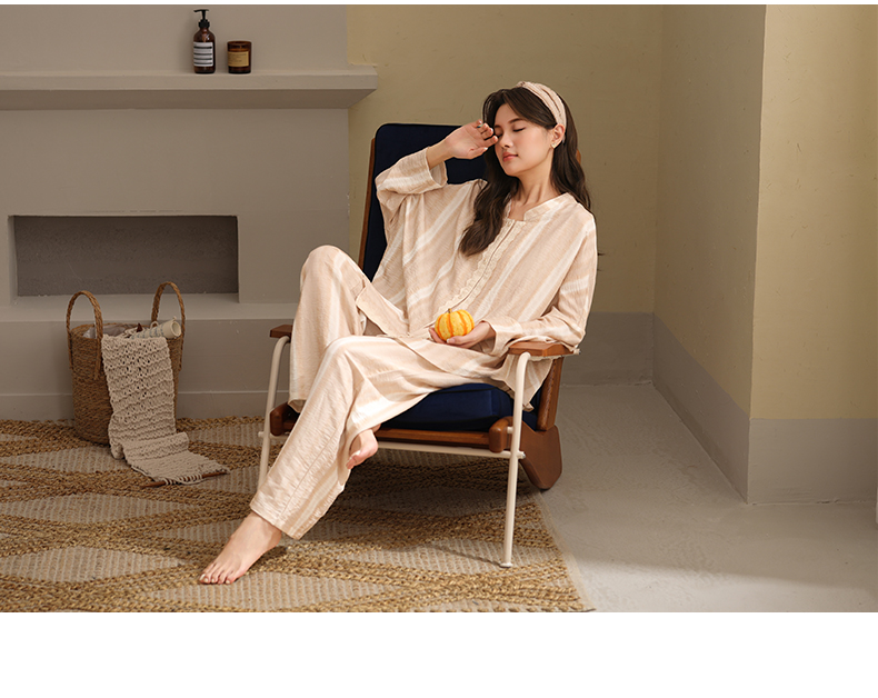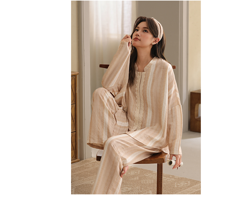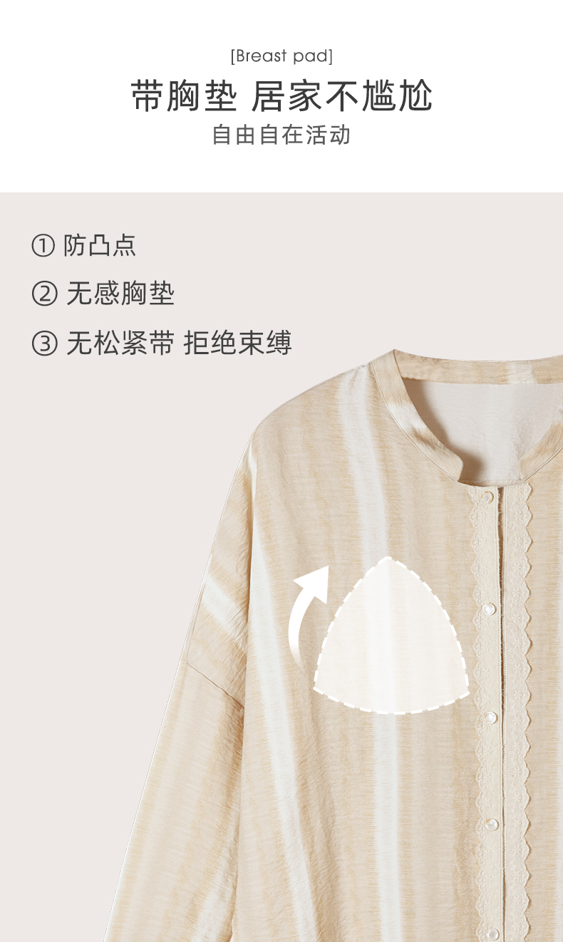 可人儿春秋季带bra泡泡绵女士长袖长裤睡衣可外出小众家居服套装