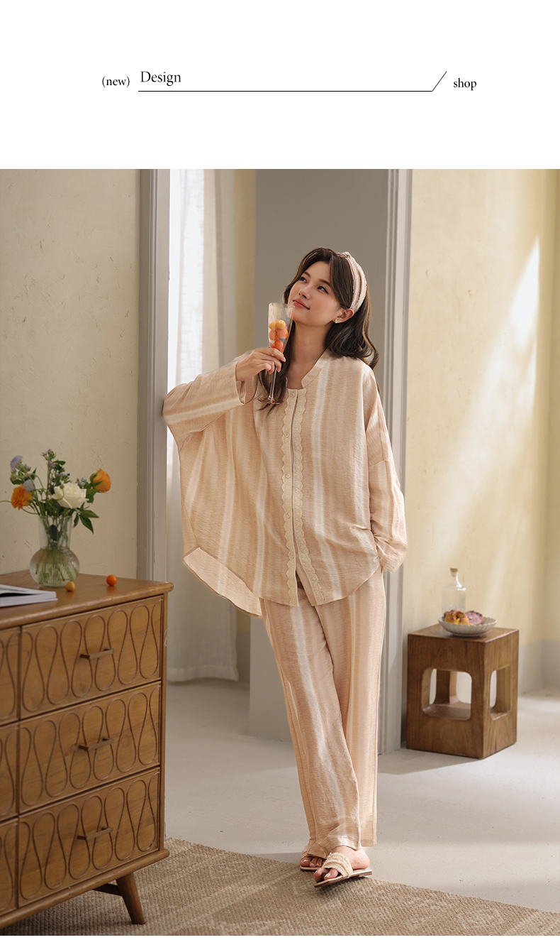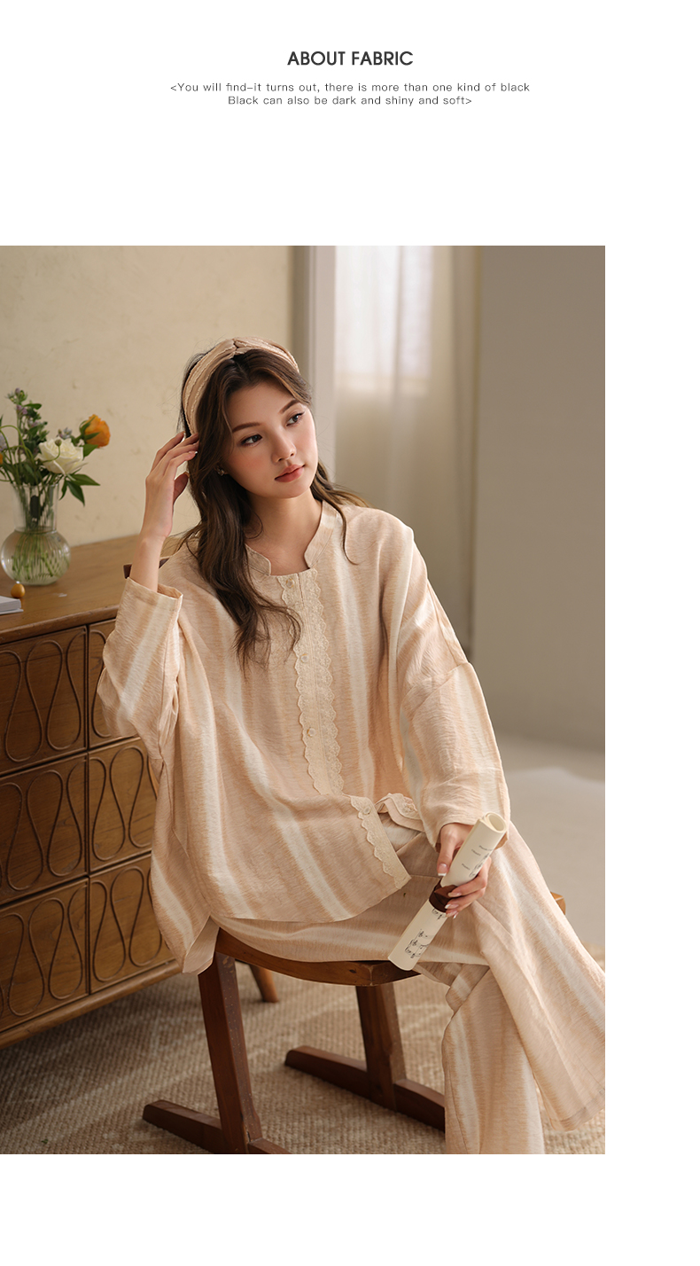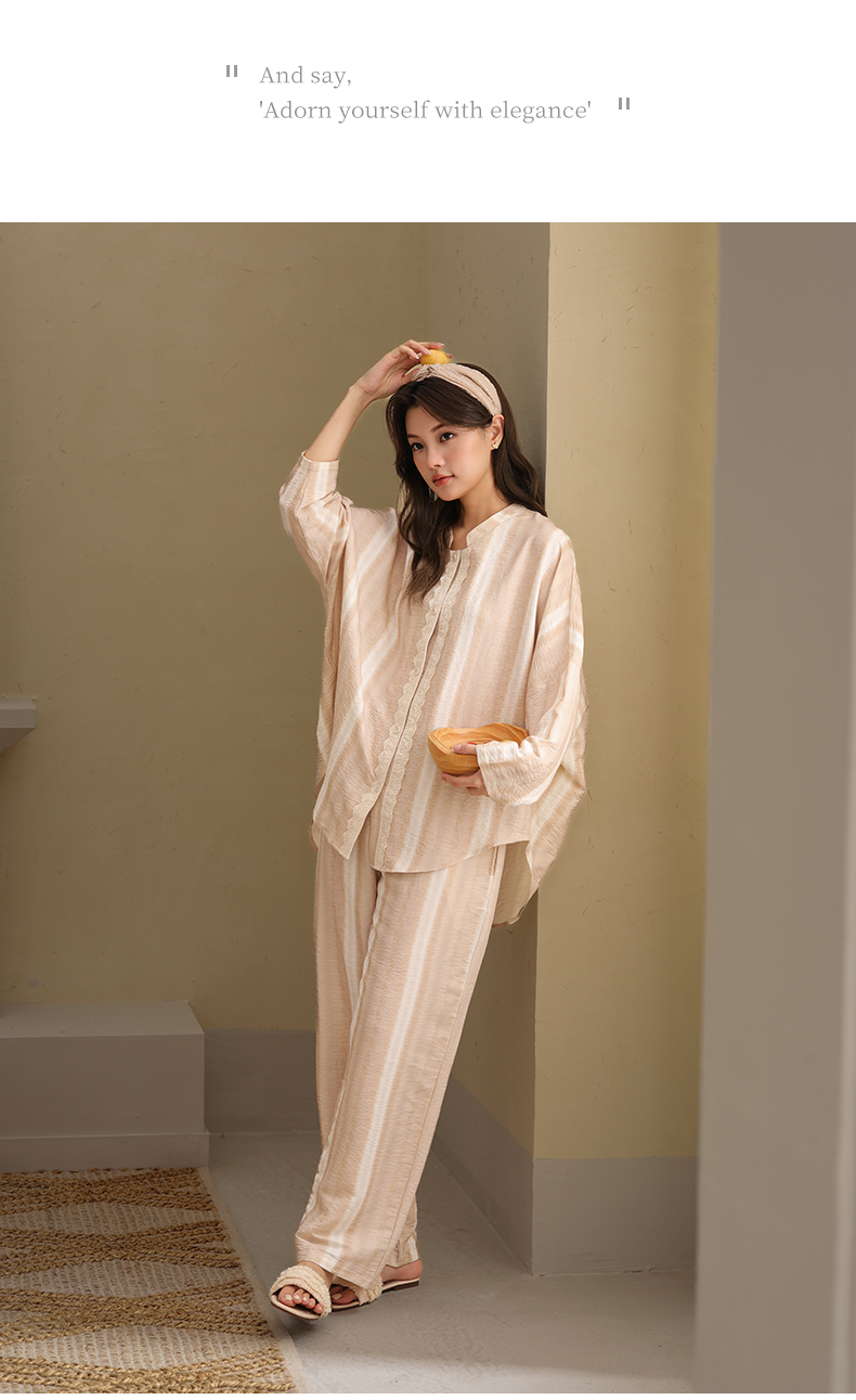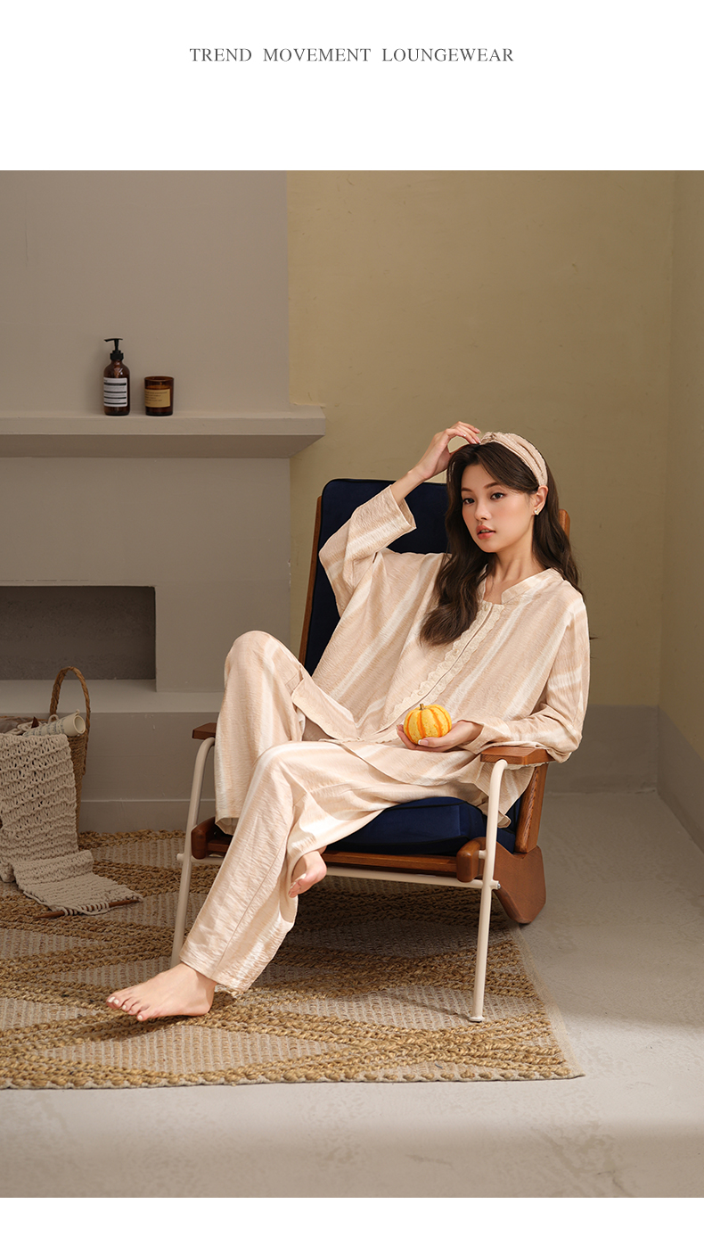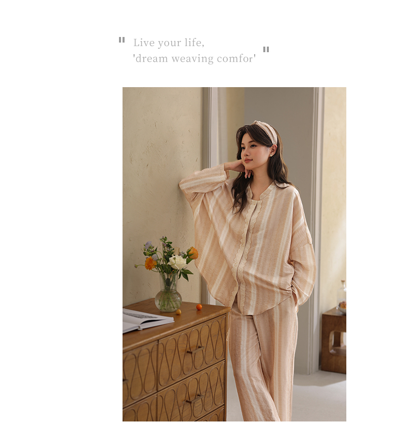 可人儿春秋季带bra泡泡绵女士长袖长裤睡衣可外出小众家居服套装