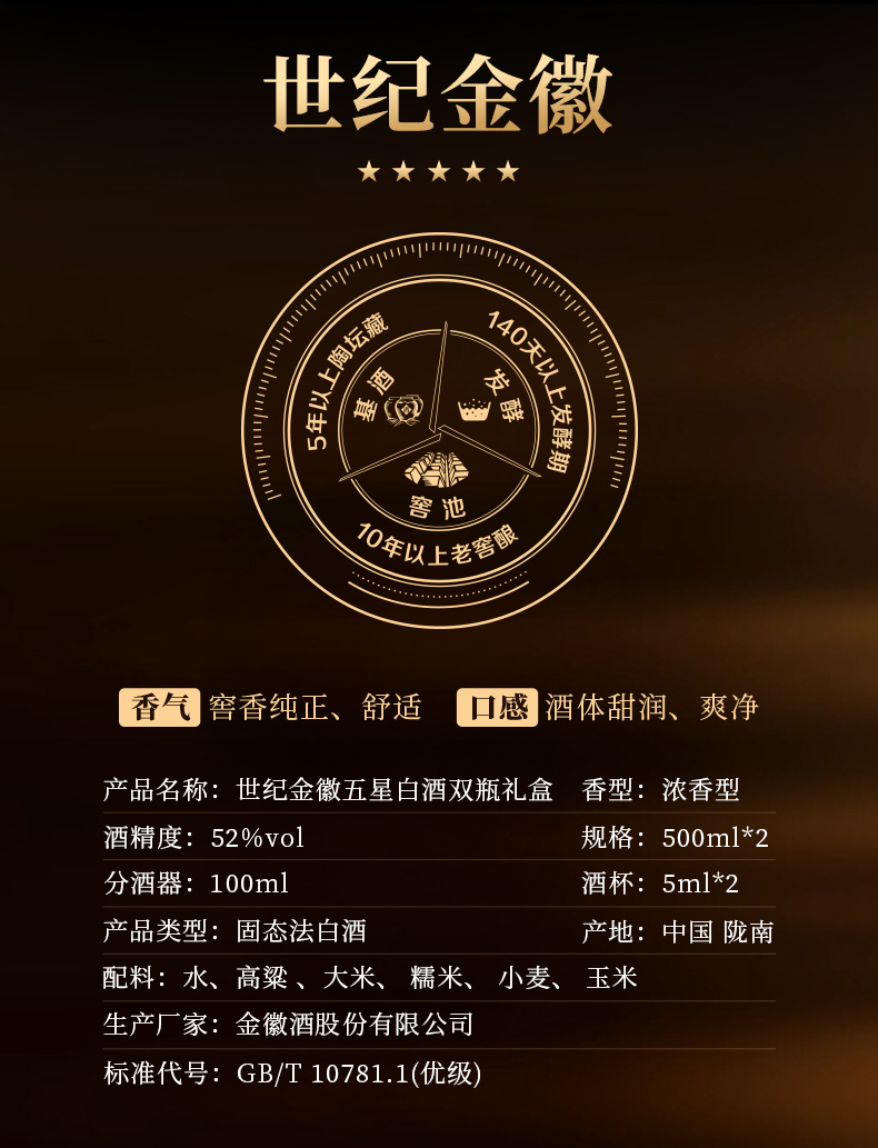 【五星双瓶礼盒】金徽酒 52度世纪金徽五星 白酒礼盒
