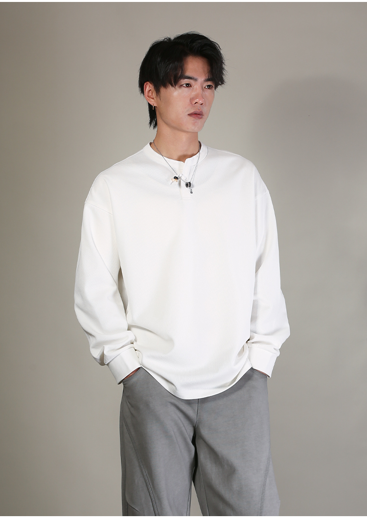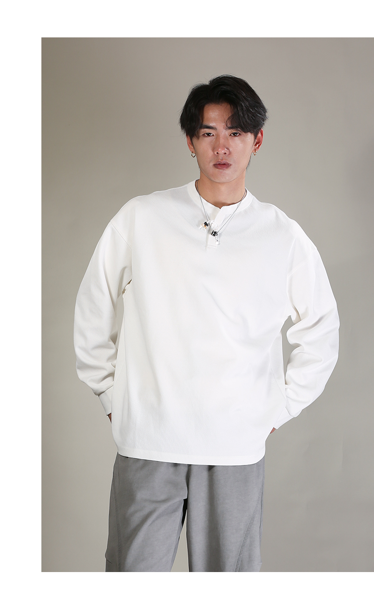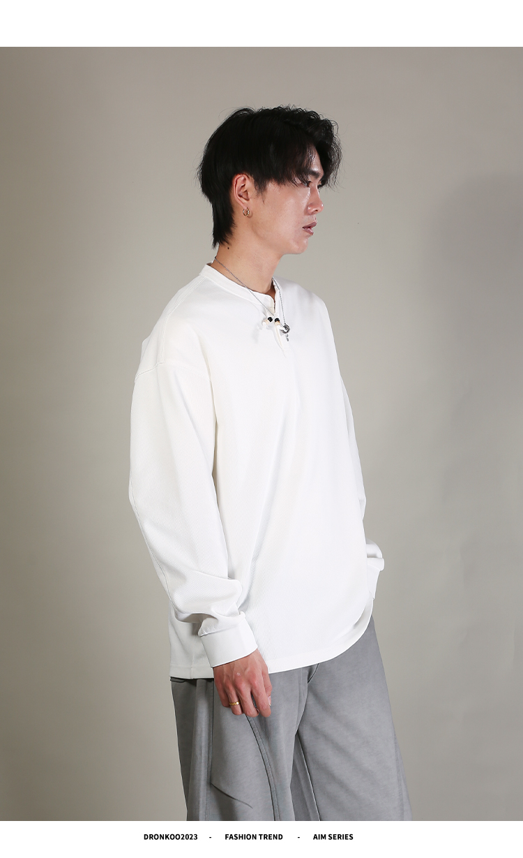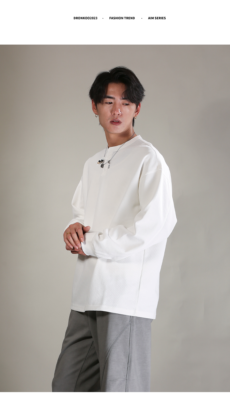 DRONKOO 2026 圆亨利领开扣钉珠装饰微阔长袖中厚T恤